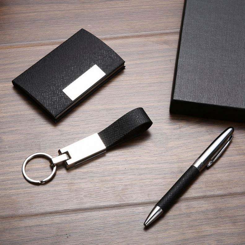 Personalized Business Gift Set: PU Leather Card Holder Keychain & Metal Pen with Custom Logo - Perfect for Corporate Giveaways