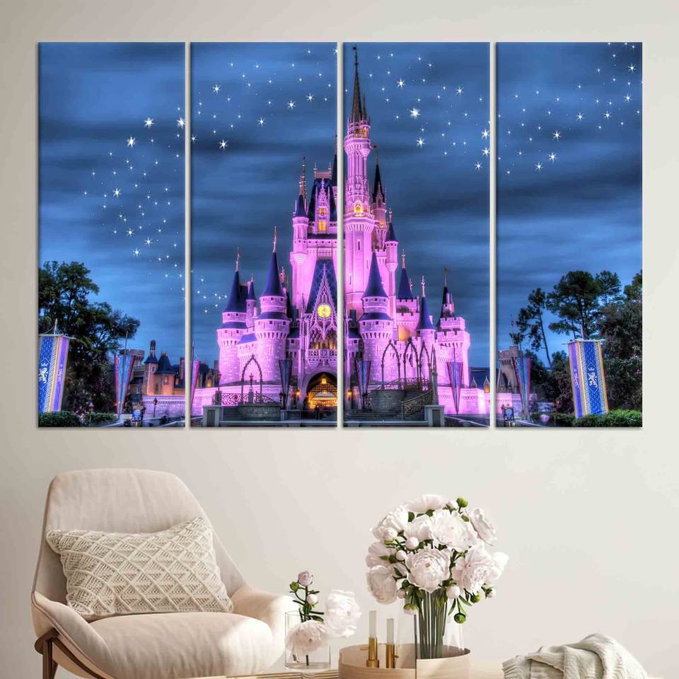 ภาพพิมพ์บนผ้าใบปราสาทซินเดอเรลล่าแบบส่วนตัว: ศิลปะสำหรับห้องเด็กทารกที่มีท้องฟ้าเต็มไปด้วยดวงดาว ชุดผ้าใบ 4 ชิ้น