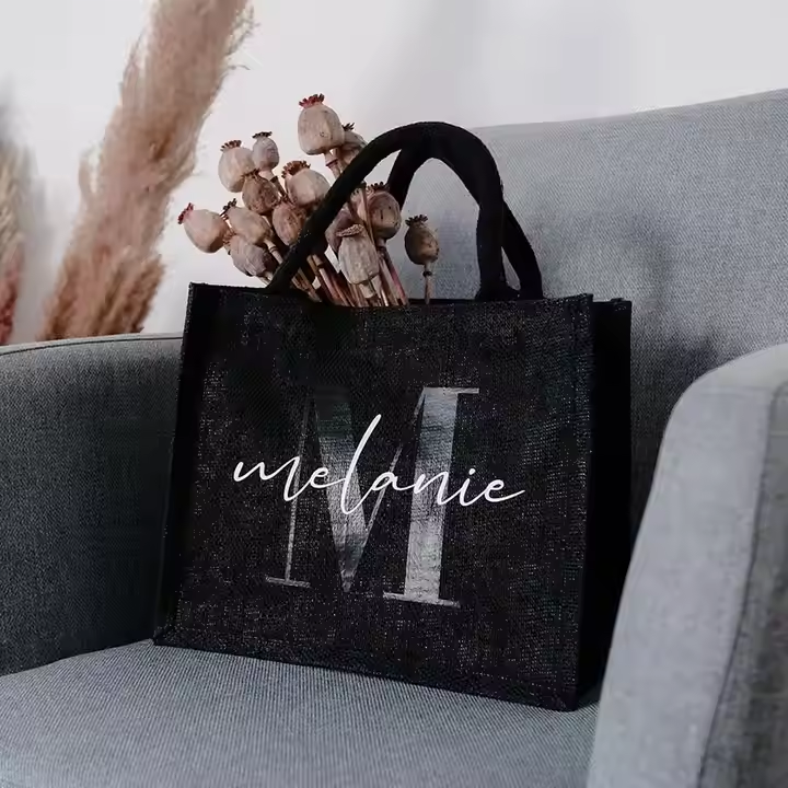 ถุงผ้าปอกระเจาช้อปปิ้งเป็นมิตรต่อสิ่งแวดล้อมกระเป๋าถือแบบพกพาส่วนบุคคลกระเป๋าของขวัญสีดำกันน้ำสำหรับโปรโมชั่น