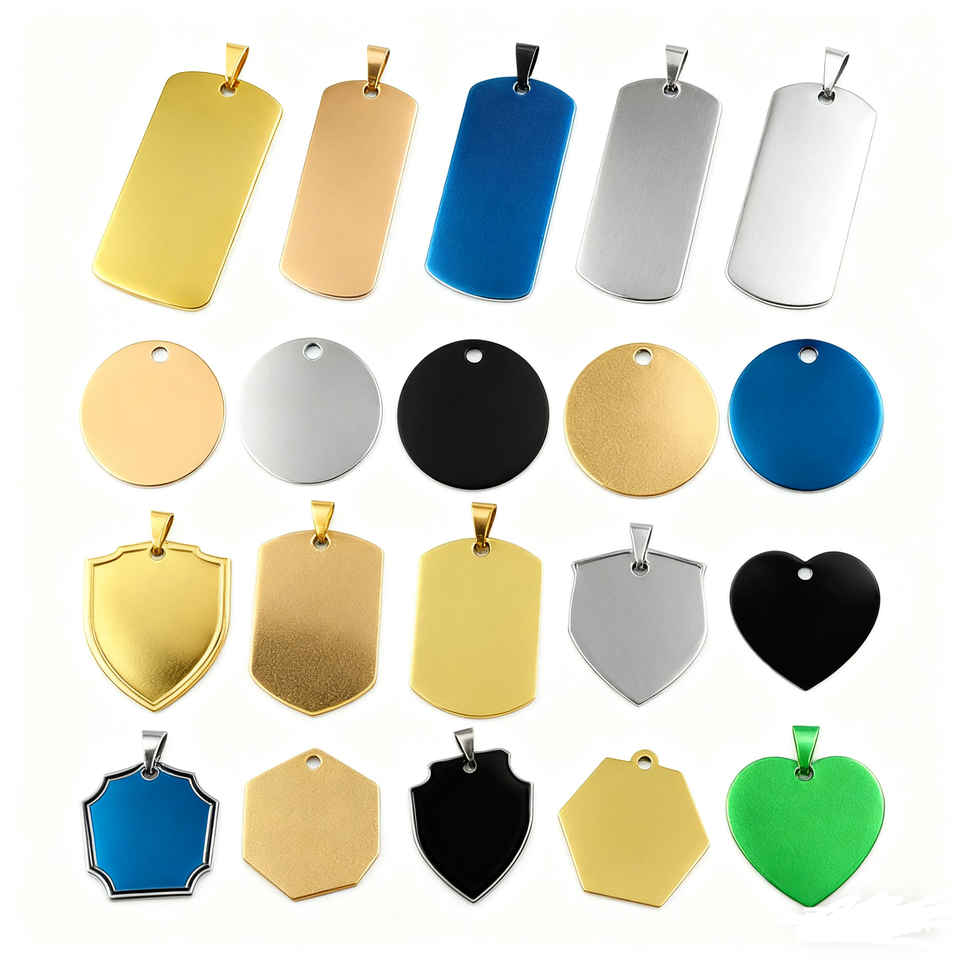 สร้อยคอสำหรับสุนัขทำจากสเตนเลสสตีลที่มีจี้รูปทรงแปลกๆสลักโลโก้โลหะ