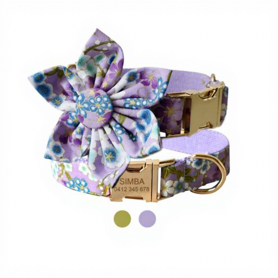 ชุดสายจูงปลอกคอสุนัขลายดอกไม้และดอกไม้มีลายดอกไม้สีม่วงสไตล์ญี่ปุ่นแกะสลักแบบมีลักษณะเฉพาะตัว