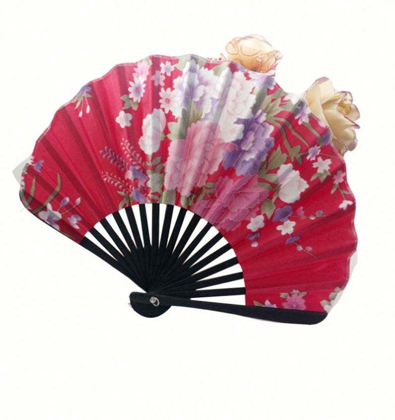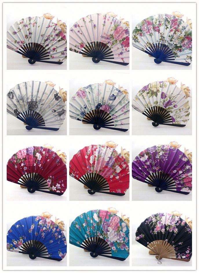 พัดมือพับลายดอกไม้แบบจีนญี่ปุ่น ทำจากผ้าและไม้ไผ่ พร้อมถุงของขวัญ สำหรับงานแต่งงานและงานปาร์ตี้