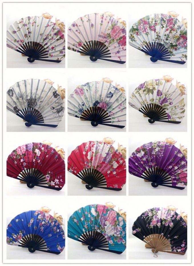 พัดมือพับลายดอกไม้แบบจีนญี่ปุ่น ทำจากผ้าและไม้ไผ่ พร้อมถุงของขวัญ สำหรับงานแต่งงานและงานปาร์ตี้