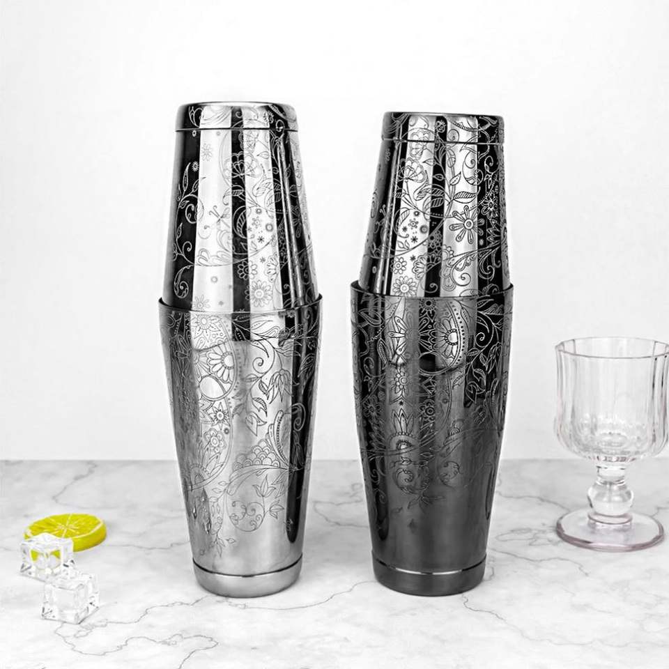 แก้วเชคเกอร์บอสตันสแตนเลสสตีล 304 ขนาด 850+550 มล. ขัดเงาแบบกระจก สำหรับบาร์เทนเดอร์ ผสมเครื่องดื่มค็อกเทล สลักลายดอกไม้แบบส่วนตัว