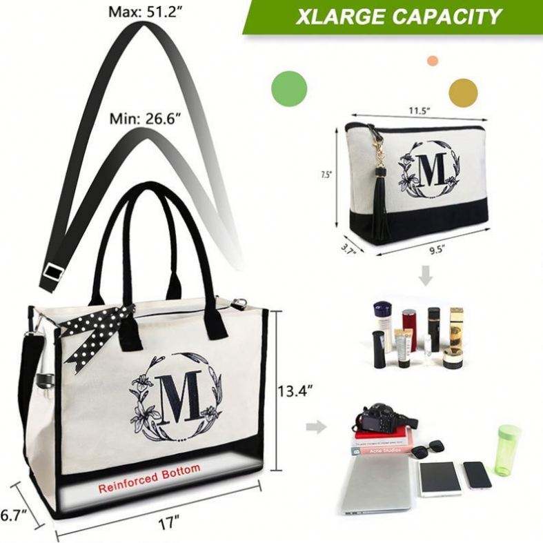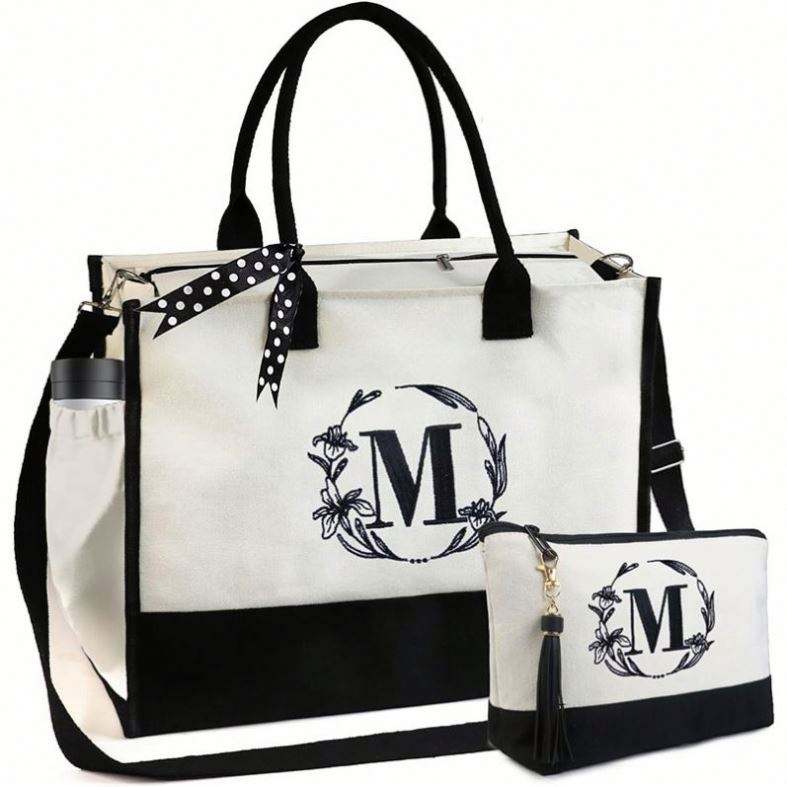 กระเป๋าผ้าแคนวาสปักอักษรย่อส่วนตัว กระเป๋าหิ้วผ้าปอกระเจาสำหรับผู้หญิง ของขวัญปักชื่อ