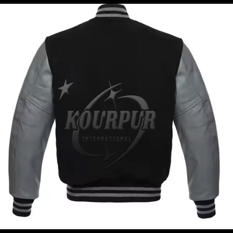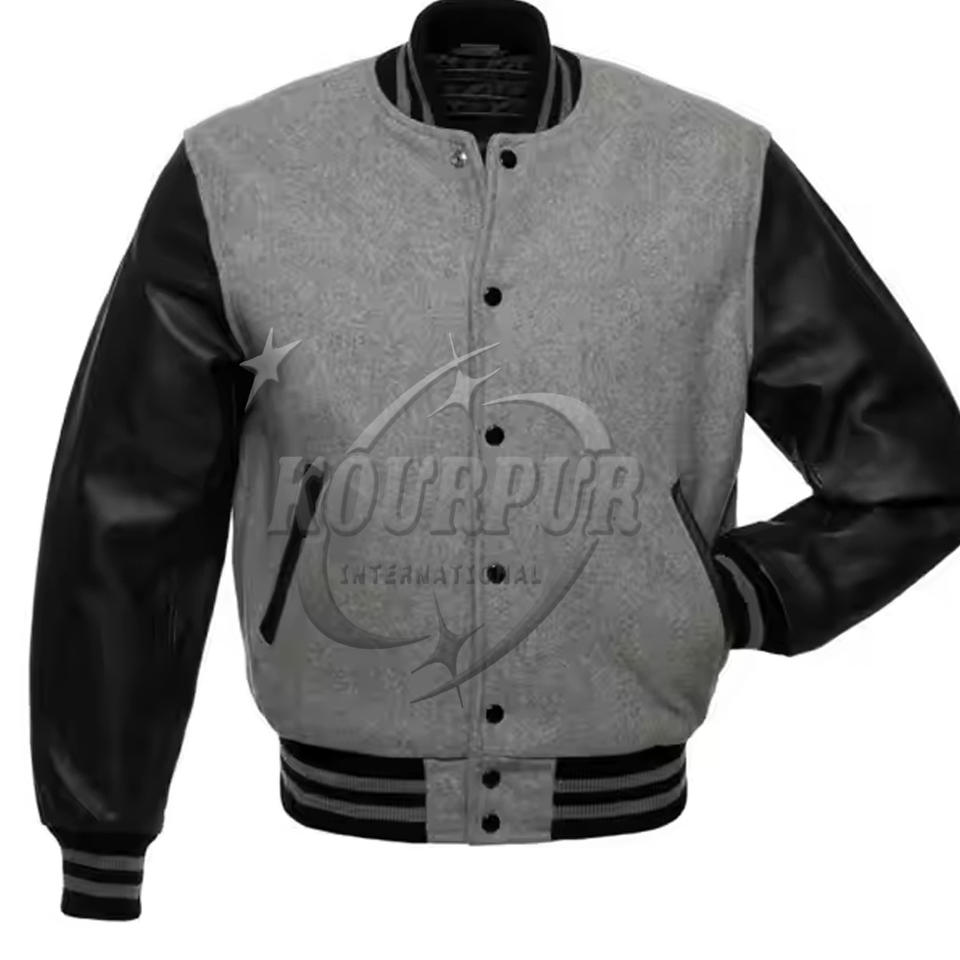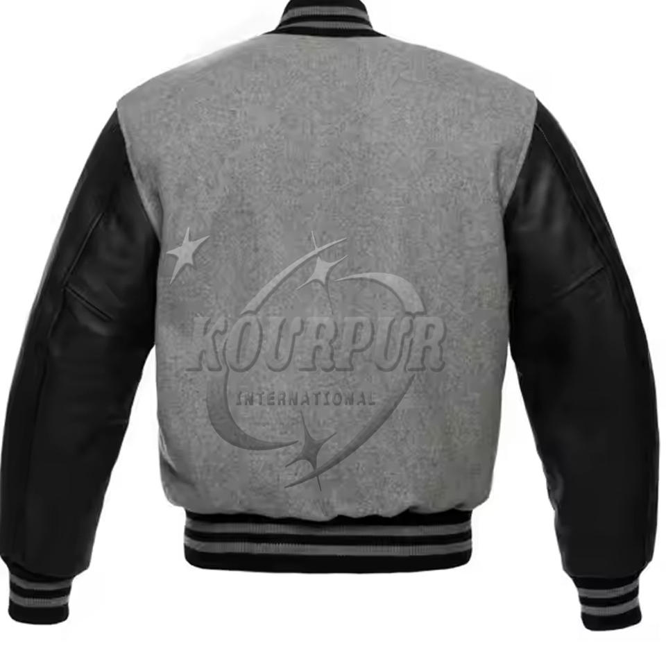 แจ็คเก็ตเบสบอลบอมเบอร์โค้ทแบบมีน้ำหนักเบาสำหรับผู้ใหญ่และเยาวชนโลโก้ข้อความเย็บสีเทาและดำสดใส