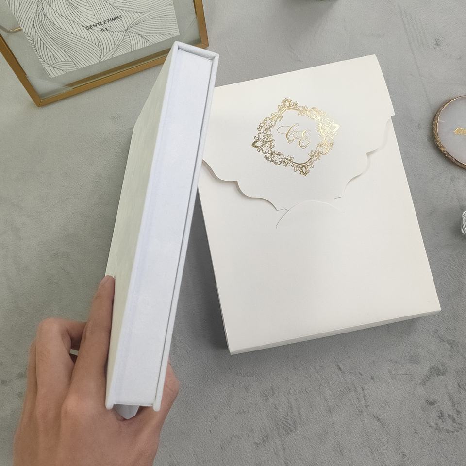 กล่องเชิญงานแต่งงานกำมะหยี่สีขาวสุดหรูแบบสั่งทำพิเศษ พร้อมการ์ดตกแต่งด้วยฟอยล์สีทอง ดีไซน์หรูหราสำหรับงานฉลองวิวาห์