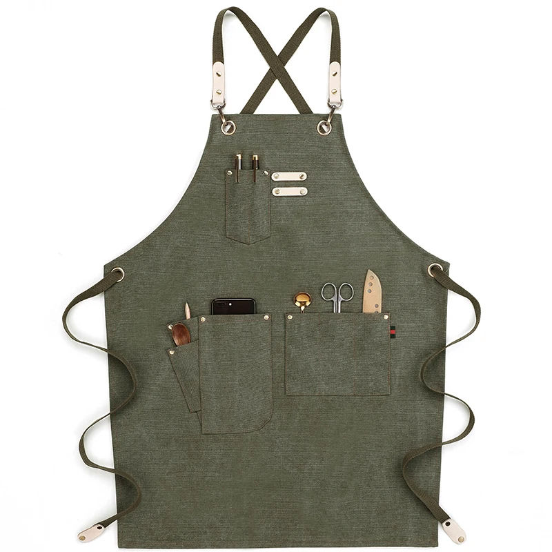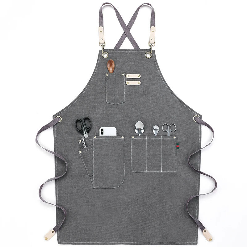 ผ้ากันเปื้อนสำหรับผู้ชายแบบมีสายรัดทำจากผ้าใบสีเทาทั้งตัวพร้อมสายหนังปรับได้สำหรับร้านอาหารเบเกอรี่คาเฟ่หรือห้องครัว