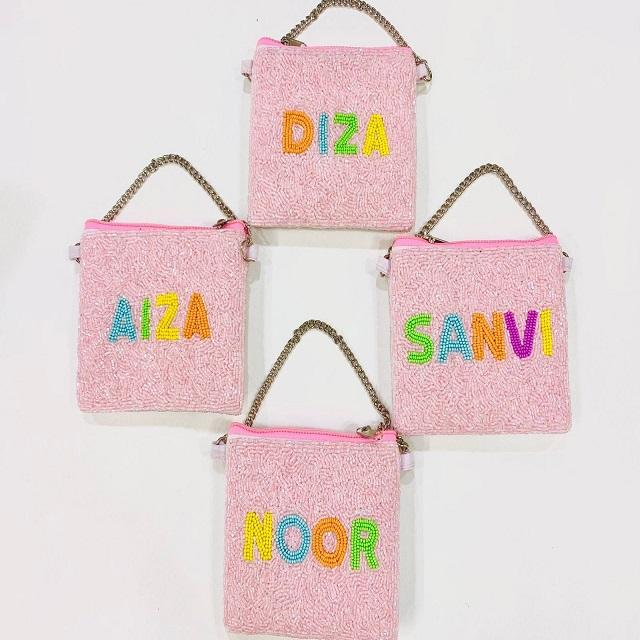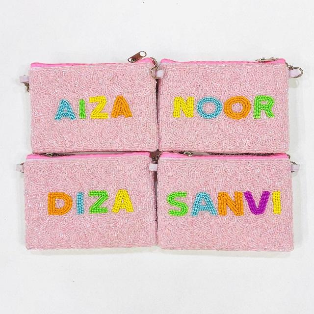 กระเป๋าสะพายข้างแบบมีสายลูกปัดเคลือบสีพร้อมชื่อสั่งทำพิเศษ สีชมพูวิบวับ ของขวัญวันเกิด ประดับลูกปัดหลากสี โดย MD HANDICRAFTS
