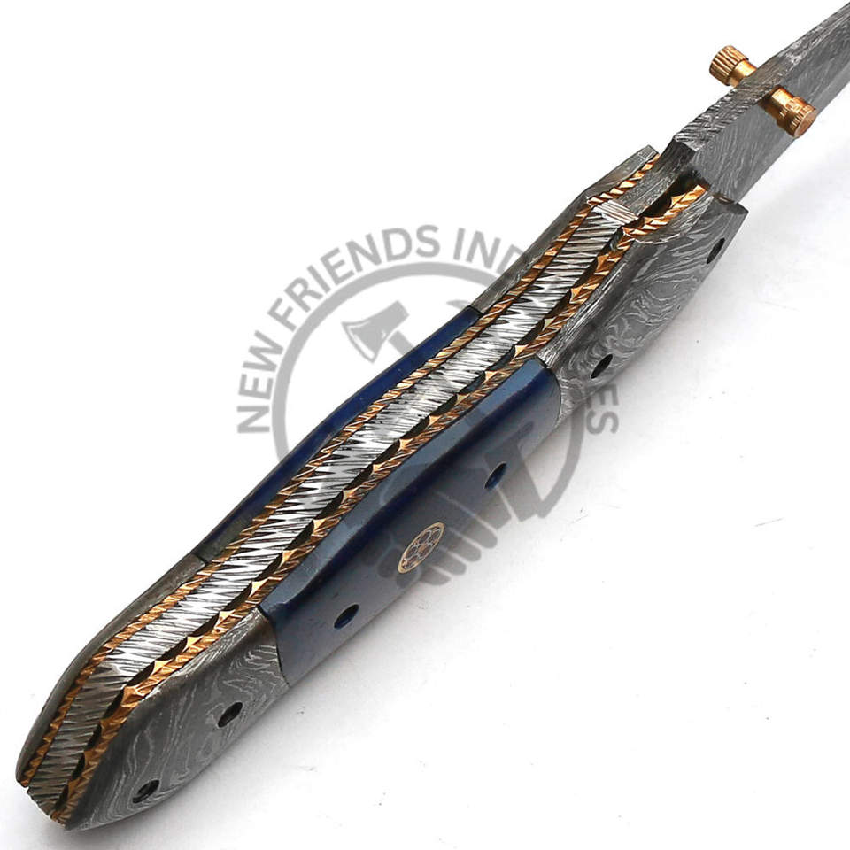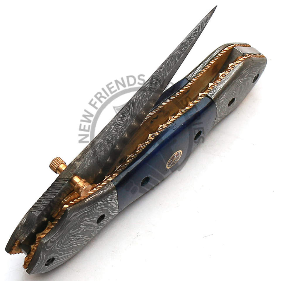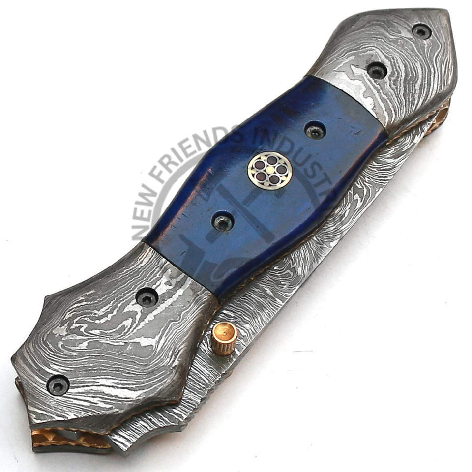 มีดพับกลางแจ้งทำจากดามัสกัสเกรดอุตสาหกรรมออกแบบได้ตามต้องการมีด้ามจับไม้หนังแบบพกพาที่มีความแข็งสูง