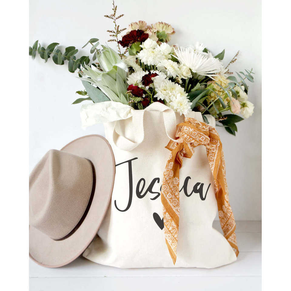 Personalized Open Closure Cotton Canvas Tote Bag with Solid Color Heart Name Pattern