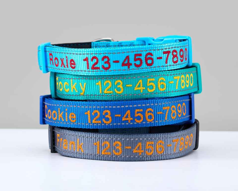 สุนัขสะท้อนแสงส่วนบุคคลพร้อมสายจูงปักชื่อสัตว์เลี้ยงที่กำหนดเองและหมายเลขโทรศัพท์ปลอกคอไนล่อนทำด้วยมือมีหลายสีสำหรับ
