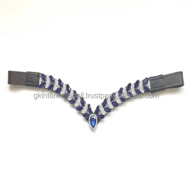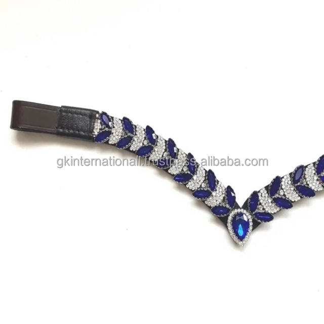 สายคาดหน้าผากม้าแบบคริสตัลสีน้ำเงินแซฟไฟร์ทรงหยดน้ำแบบปรับได้ ประดับด้วยคริสตัลรูปตัววี สายคาดหน้าผากม้าหนังสีดำน้ำตาล