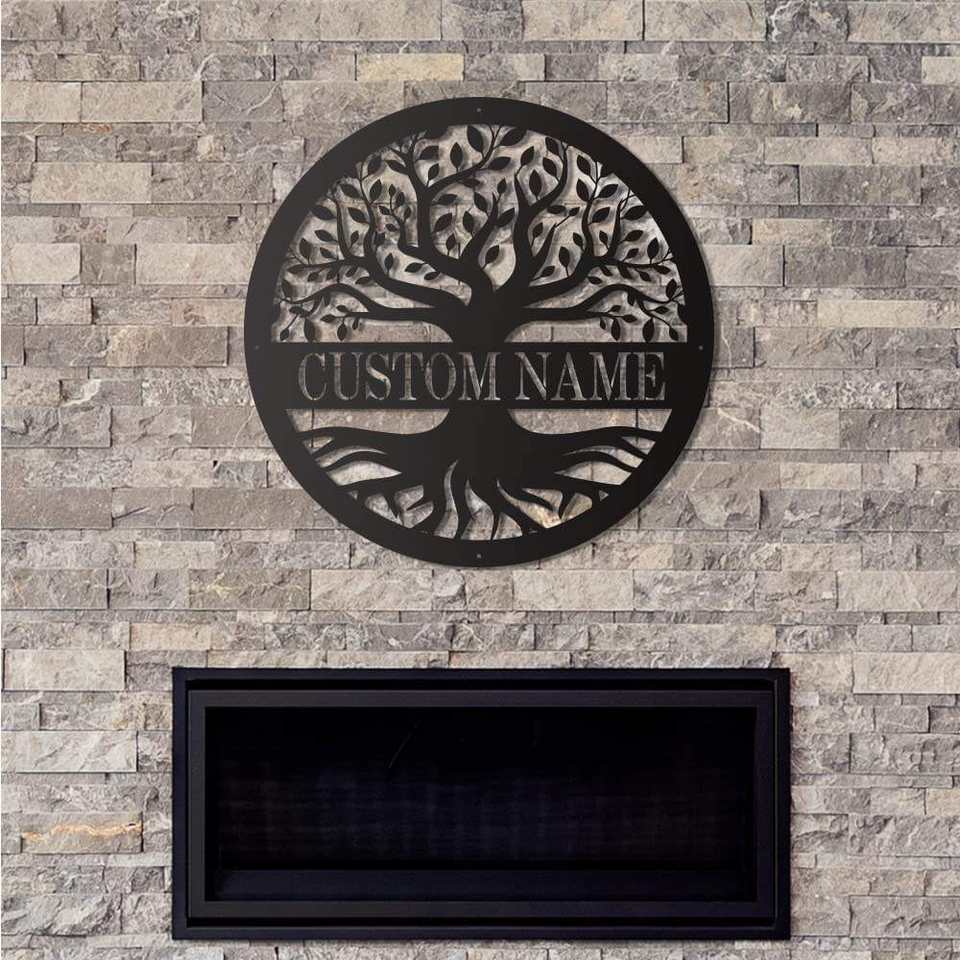 งานศิลปะติดผนังโลหะรูปต้นไม้แห่งชีวิตแบบสั่งทำได้ พร้อมป้ายตกแต่งผนังทรงกลมสลักชื่อ