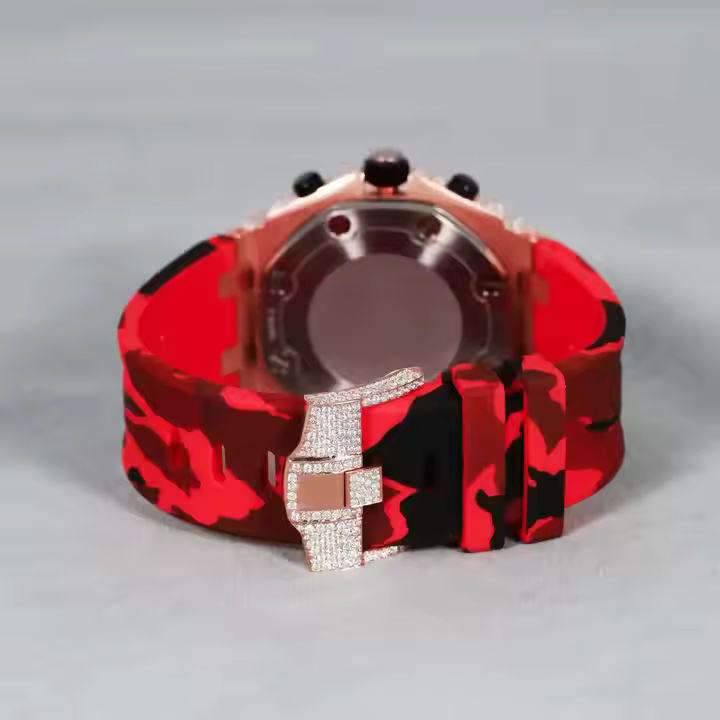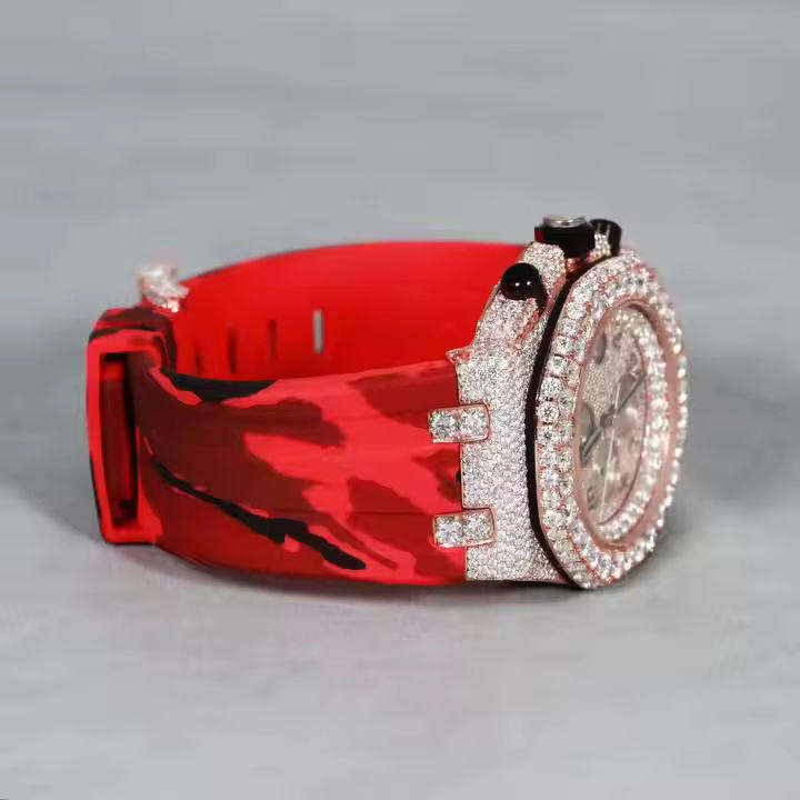 นาฬิกาข้อมือสไตล์ฮิปฮอป รุ่นสปอร์ตหรูหรา แบบยูนิเซ็กซ์ ประดับเพชรโมอิสซาไนต์ VVS ครึ่งหน้าปัด ตัวเรือนสแตนเลสสีแดง สายหนัง ดีไซน์เฉพาะตัว