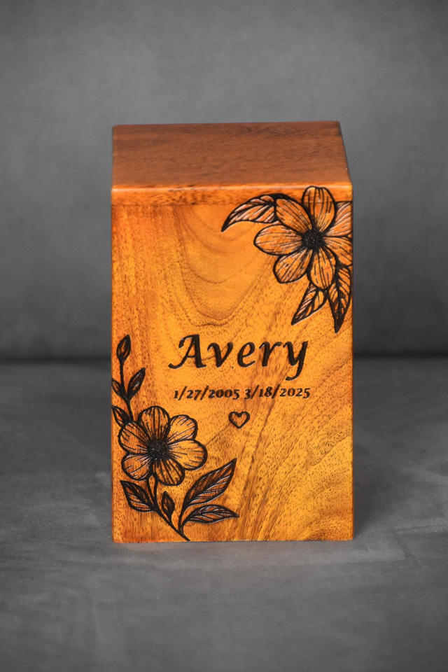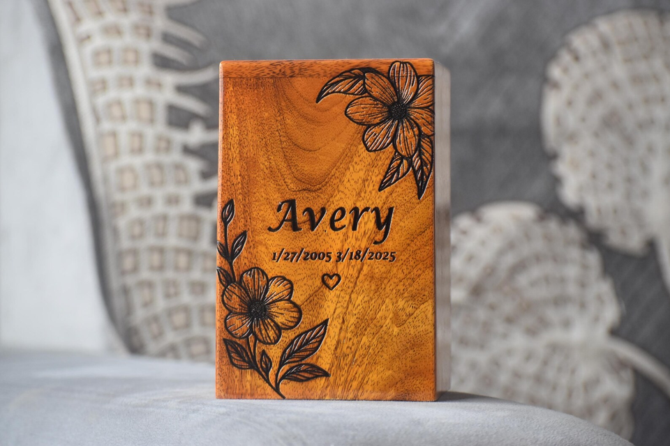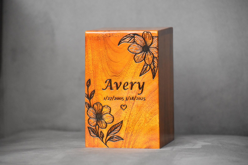 โกศเผาไม้ส่วนบุคคลพร้อมสลักลายดอกไม้พร้อมกล่องสลักชื่อตามสั่งและกล่องฝังศพ