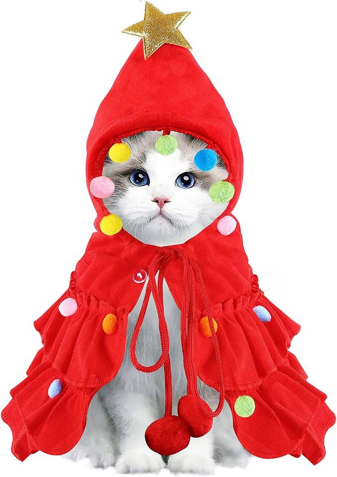 เสื้อคลุมสัตว์เลี้ยงพร้อมหมวกที่มีดาวและปอมปอมสำหรับลูกสุนัขเคปเสื้อผ้าอุปกรณ์สำหรับงานเลี้ยงอุปกรณ์สำหรับสัตว์เลี้ยงขนาดเล็กสุนัขแมวสัตว์เลี้ยงซานต้าของขวัญ