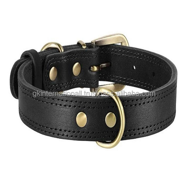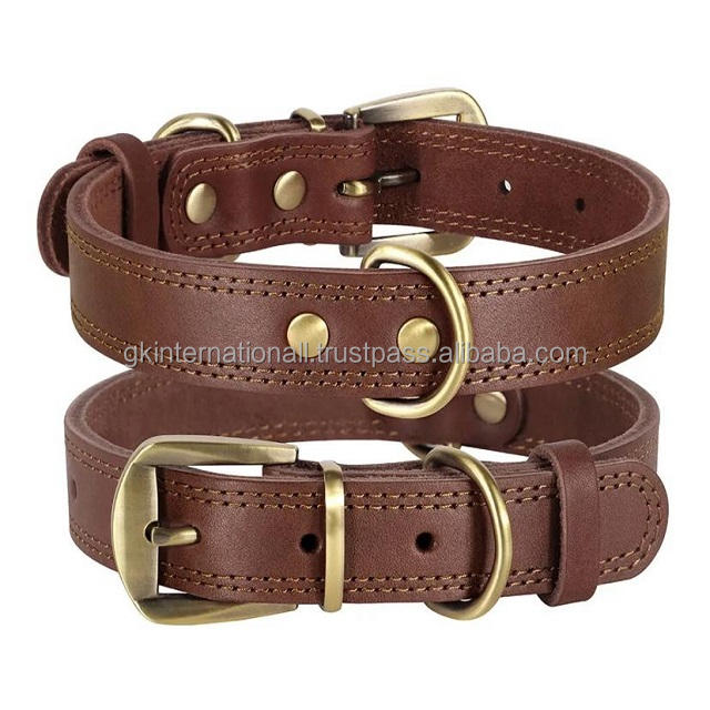 ปลอกคอสุนัขหนังแท้ปรับได้สำหรับสุนัขขนาดเล็กกลางหรือใหญ่เย็บคู่และฮาร์ดแวร์ทองเหลืองแข็ง