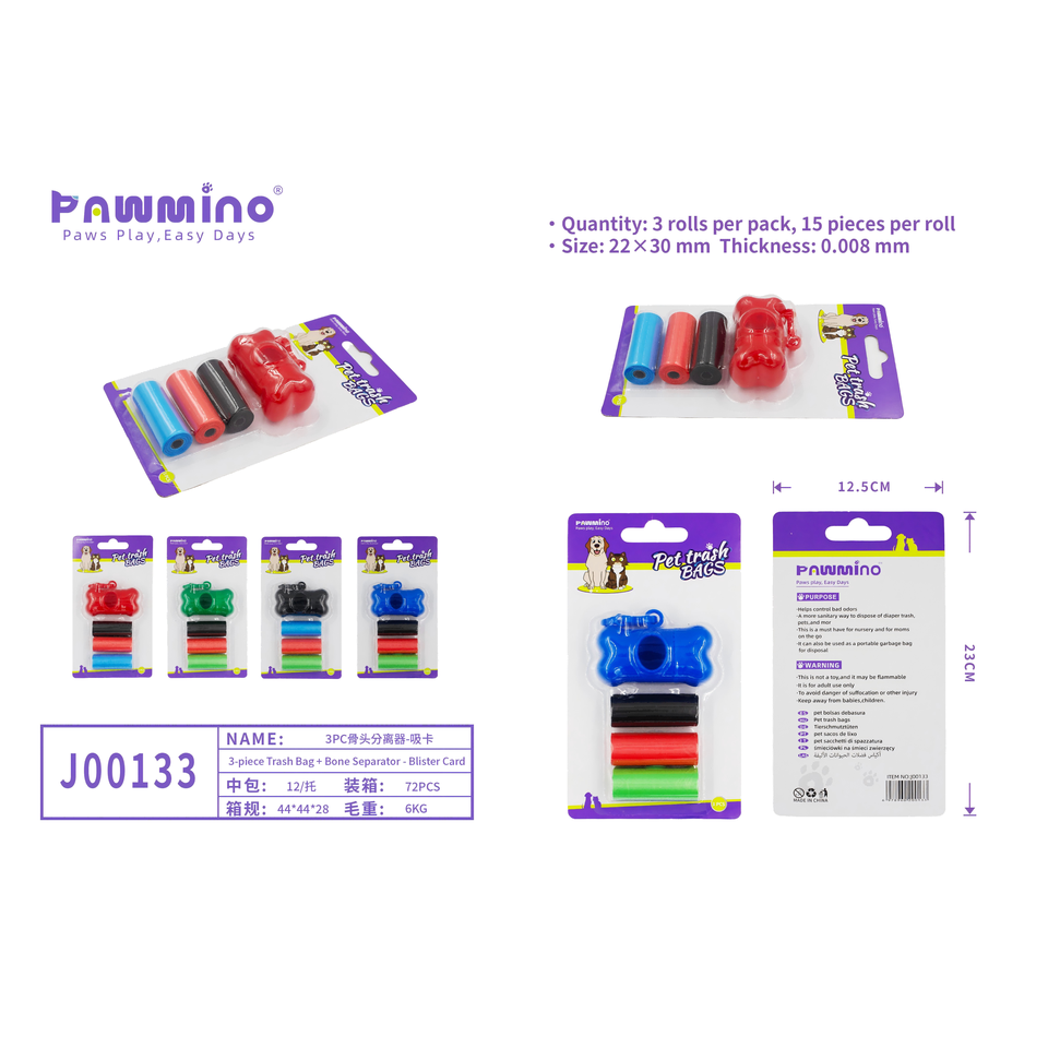 ถุงขยะสำหรับสัตว์เลี้ยง 3 ม้วน ย่อยสลายได้ กันน้ำ เป็นมิตรกับสิ่งแวดล้อม สำหรับสุนัข ลายพิมพ์อุ้งเท้า สีแดง ม่วง ขาว