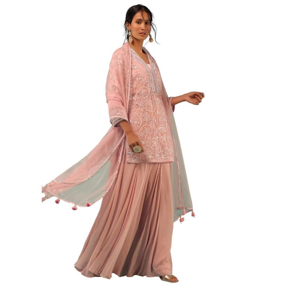 ชุดสูทชาราปักลายกลีบดอกไม้สีชมพูพร้อมรายละเอียดแบบตัด Dana jaal สำหรับงานแต่งงานและงานรื่นเริง