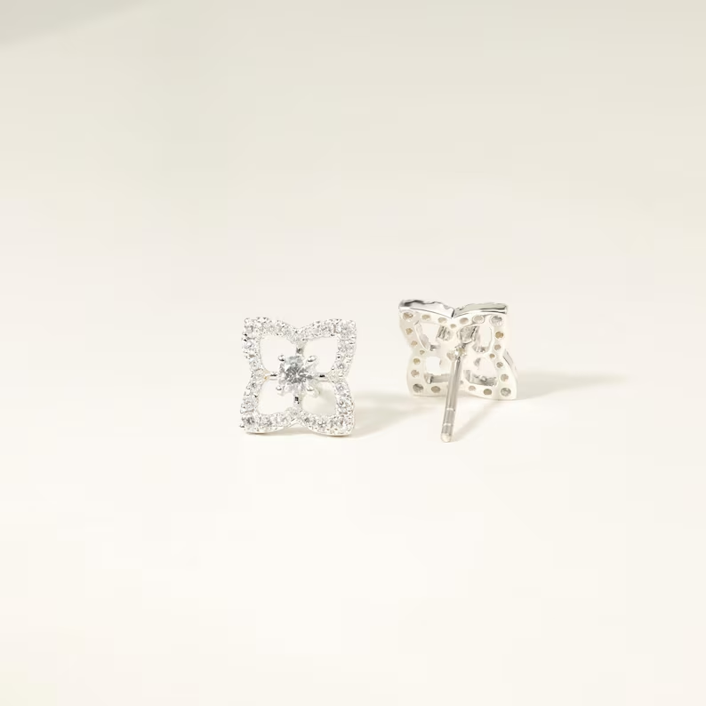 ต่างหูเพชรทรงกลมขนาดเล็ก ดีไซน์ดอกไม้ เพชรเพาะเลี้ยง ตัวเรือนทองคำแท้ ดีไซน์สี่กลีบ สวยสง่างาม เหมาะสำหรับเจ้าสาว เครื่องประดับชั้นดี