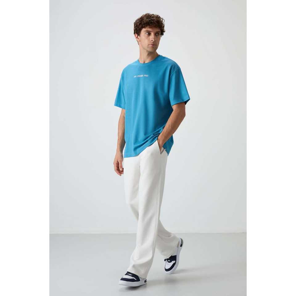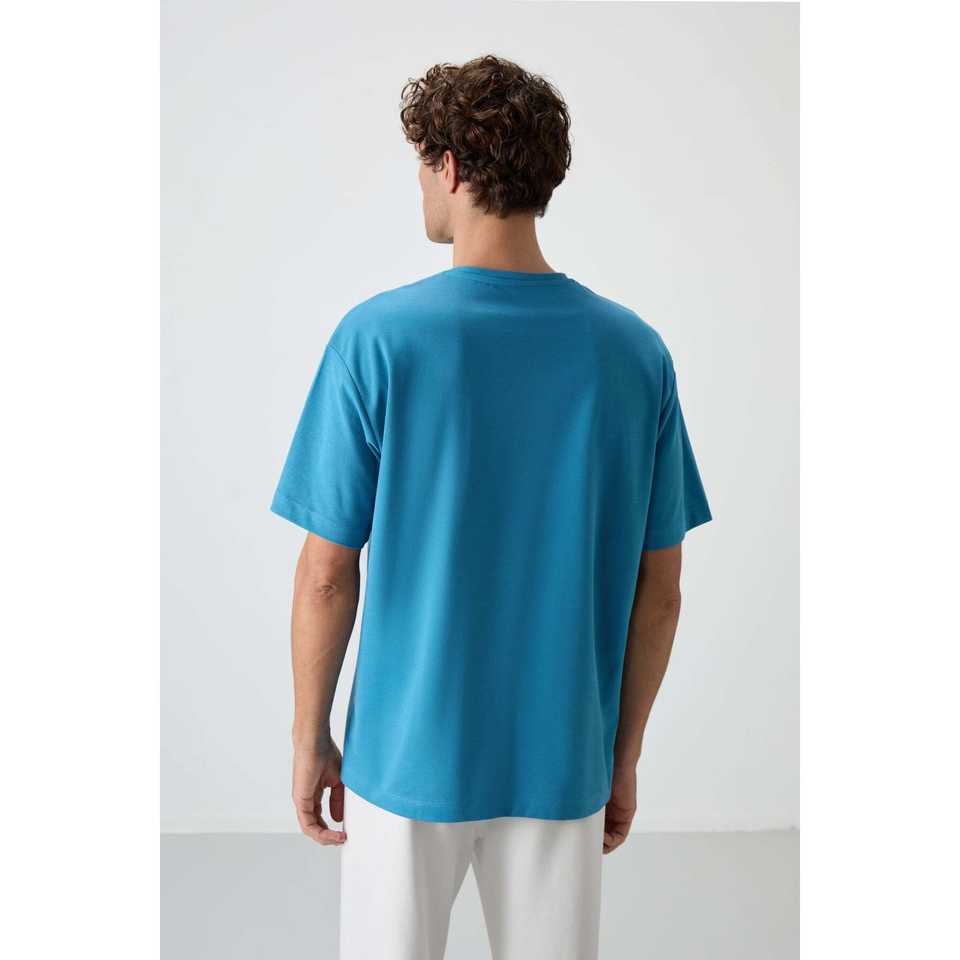 เสื้อยืดโอเวอร์ไซส์ผู้ชายสีน้ำเงินเบนซิน ผ้าฝ้าย 100% เนื้อเจอร์ซีย์หนา พิมพ์ลาย-88364