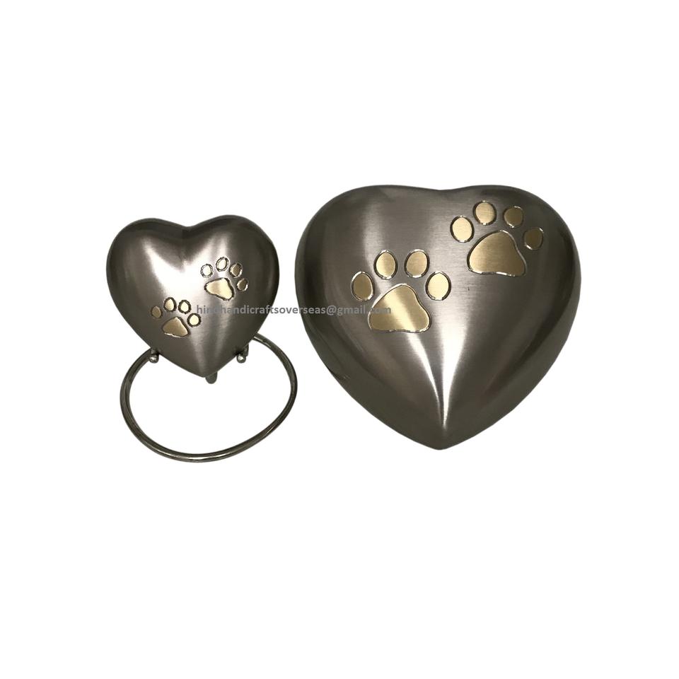 โกศบรรจุอัฐิรูปหัวใจสำหรับสัตว์เลี้ยง ทำจากทองเหลือง ทนทาน แกะสลักลายอุ้งเท้า สามารถปรับแต่งได้ สำหรับสัตว์เลี้ยงทั้งแมวและสุนัข ผลิตด้วยมือในอินเดีย