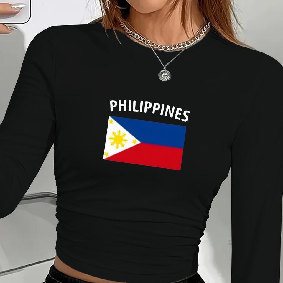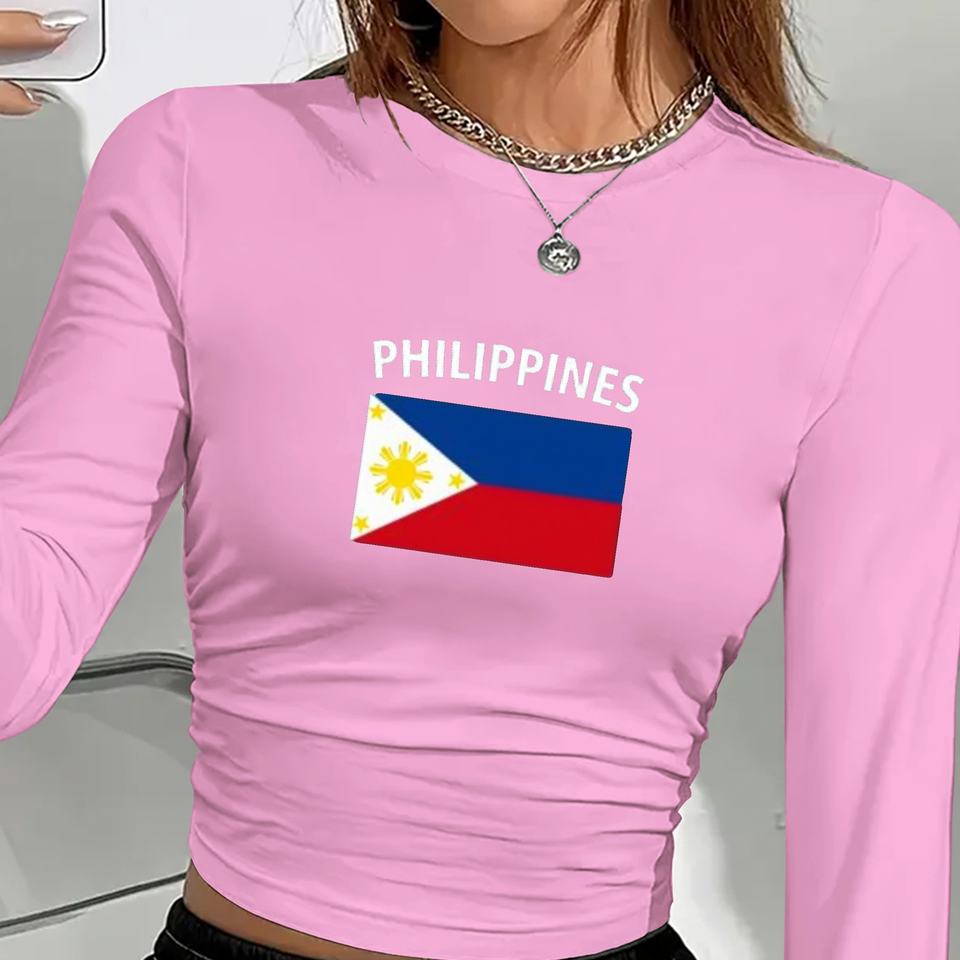 เสื้อครอปแขนยาวพิมพ์ลายธงชาติฟิลิปปินส์สำหรับผู้หญิง สไตล์ Y2K คอกลม ผ้าถักผสมสแปนเด็กซ์และโพลีเอสเตอร์ เหมาะสำหรับทุกฤดูกาล