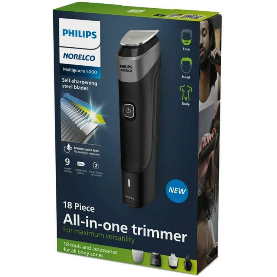 ชุด Philips norelco multigom 5000 18ชิ้น, เคราใบหน้า, ผม, ร่างกายและเครื่องเล็มผมที่ใกล้ชิดสำหรับผู้ชาย-ไม่มีน้ำมันใบมีด MG5900/49