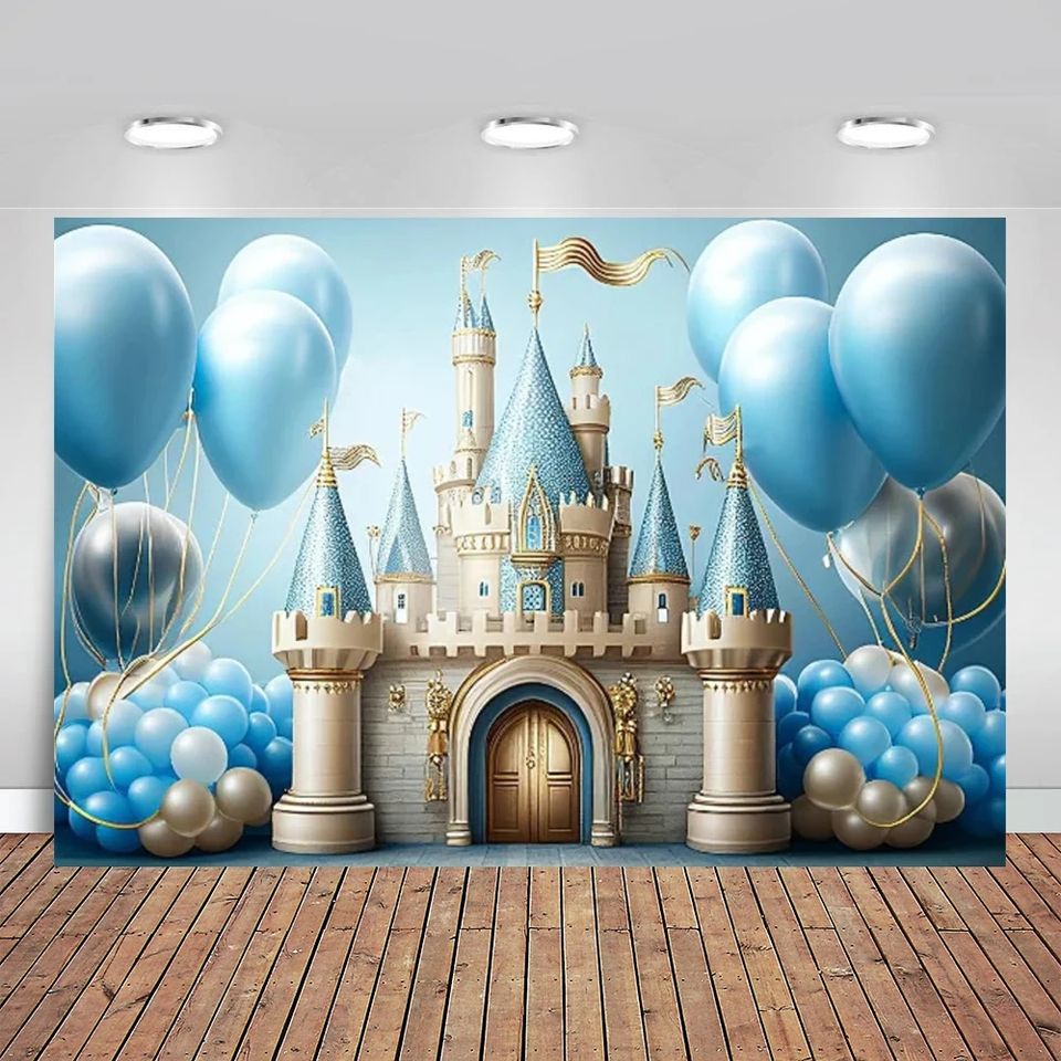 การถ่ายภาพพื้นหลังนิยายปราสาทสีฟ้าดอกไม้บอลลูนเจ้าชายเด็กวันเกิดตกแต่งภาพฉากหลังสตูดิโอ