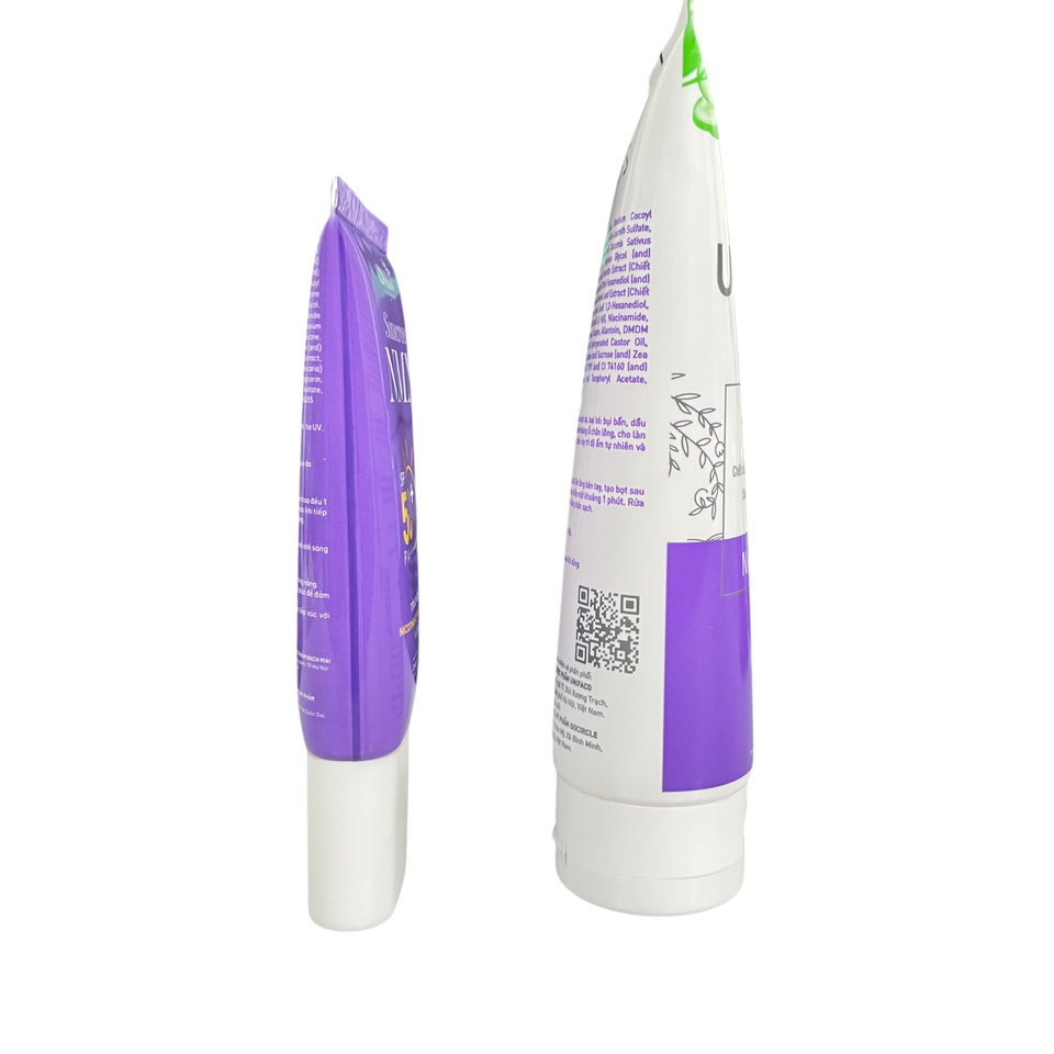 บรรจุภัณฑ์กันแดด Phuc Nguyen เวียดนาม หลอดครีมกันแดด PE 50 มล. รูปทรงไข่ ฝาเกลียว พิมพ์ออฟเซ็ตแบบมันเงา ปั๊มร้อน