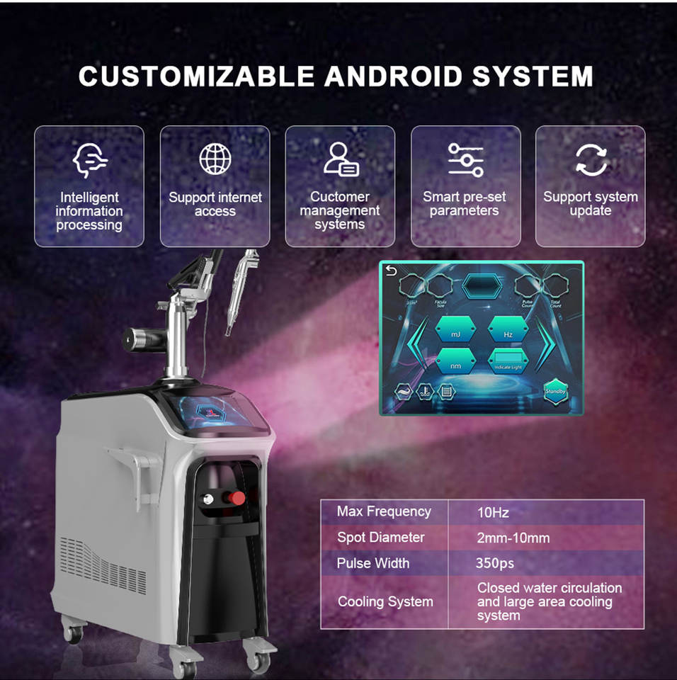 Picosecond เครื่องเลเซอร์ Q-SWITCH ND YAG อุปกรณ์ความงามแบบยืนสำหรับกำจัดรอยสักผิวฝ้าเลเซอร์จุดด่างดำ