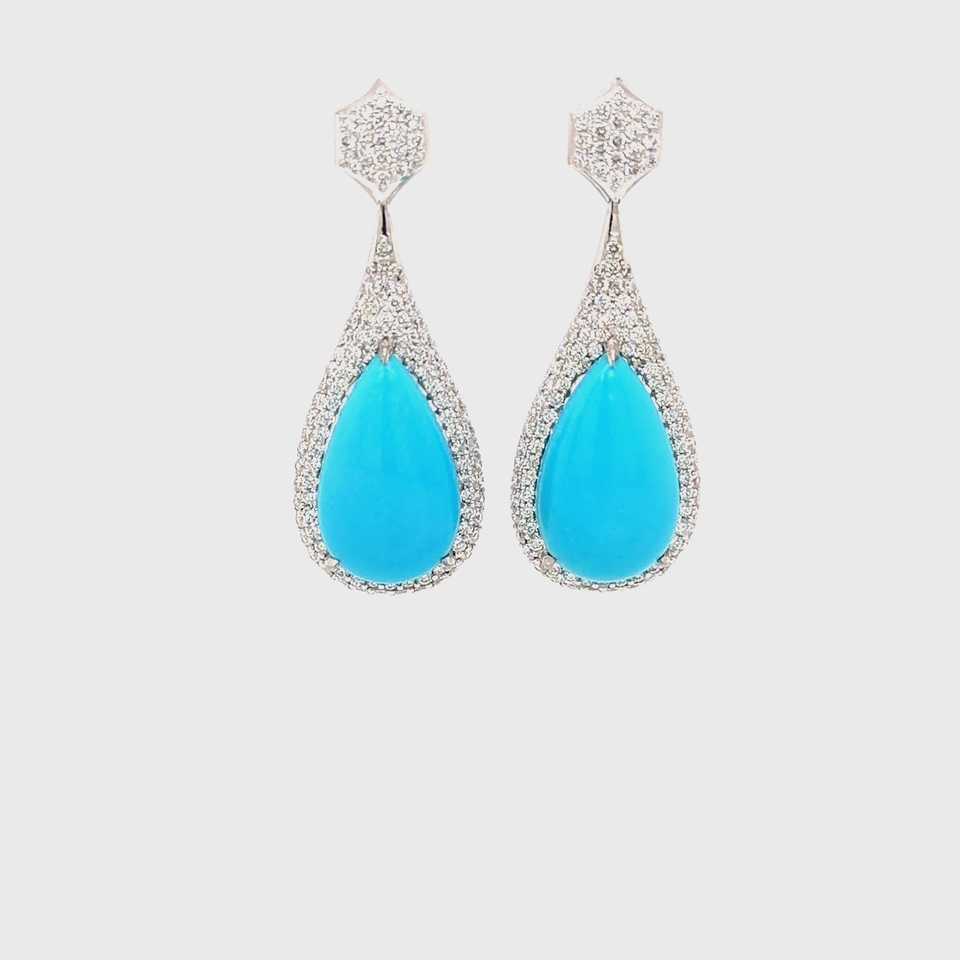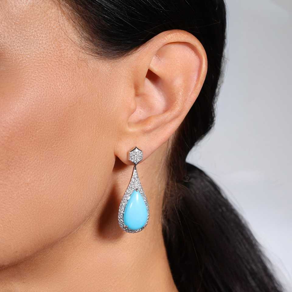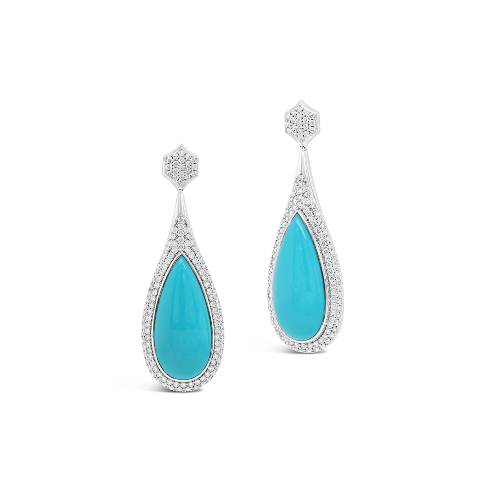 ต่างหูทองคำขาว 18K ประดับเพชรแล็บ 2.11 กะรัต และพลอยเทอร์ควอยซ์ทรงกลมเจียระไนแบบบริลเลียนท์ 14.58 กะรัต รุ่น Pillow Talk Sleeping Beauty สี D/E–VVS/VS