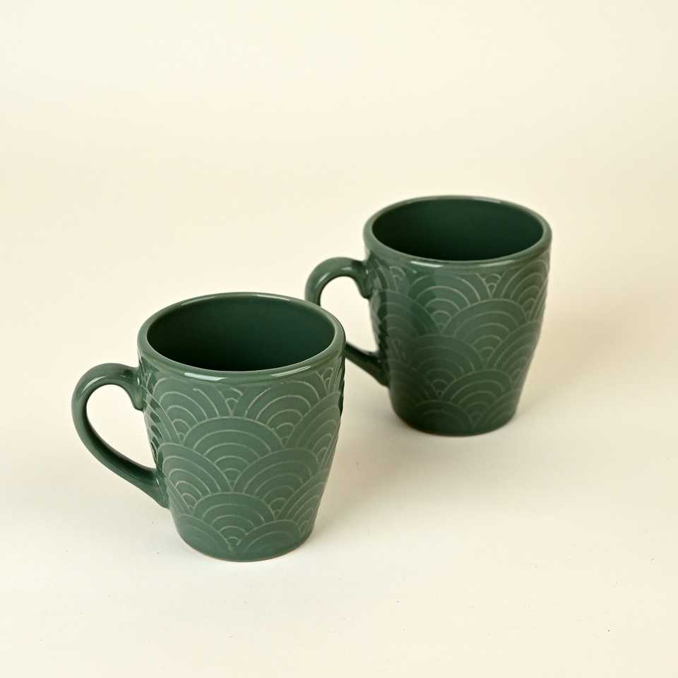 ชุดแก้วกาแฟเซรามิกดีไซน์ญี่ปุ่นสีเขียวสน 2 ใบ ใช้กับเครื่องล้างจานได้ สวยงาม เหมาะสำหรับเป็นของขวัญ