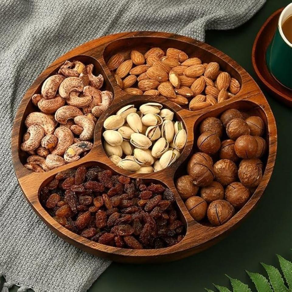 Pinewood ถาดใส่ขนมทรงหกเหลี่ยมมีห้าช่องสำหรับงานแต่งงานโรงแรมจัดเลี้ยงชาร์คิวรีแบบแห้งถาดเสิร์ฟผลไม้