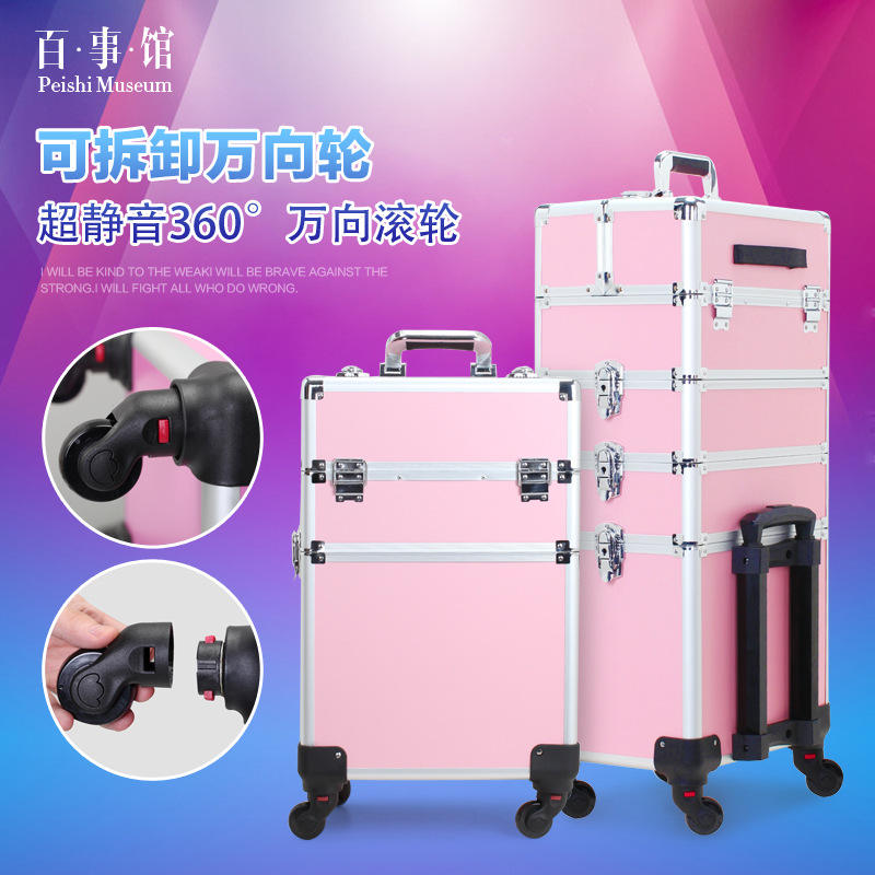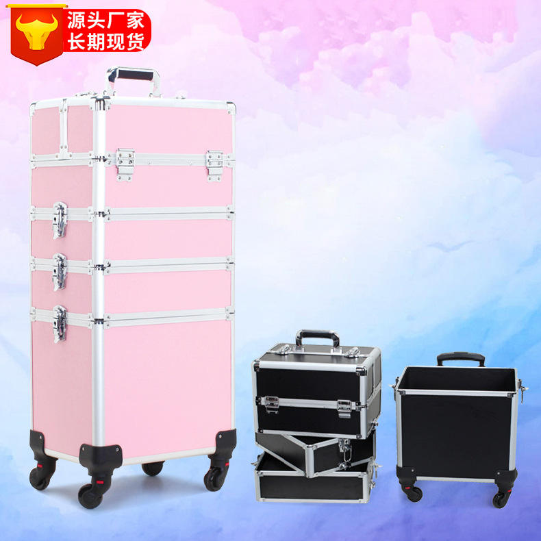 กระเป๋าเครื่องสำอางแบบล้อลากหลายชั้น สีชมพูและสีดำ พร้อมล้อหมุนได้ ความจุขนาดใหญ่ พร้อมกุญแจล็อค สำหรับใช้ในบ้าน