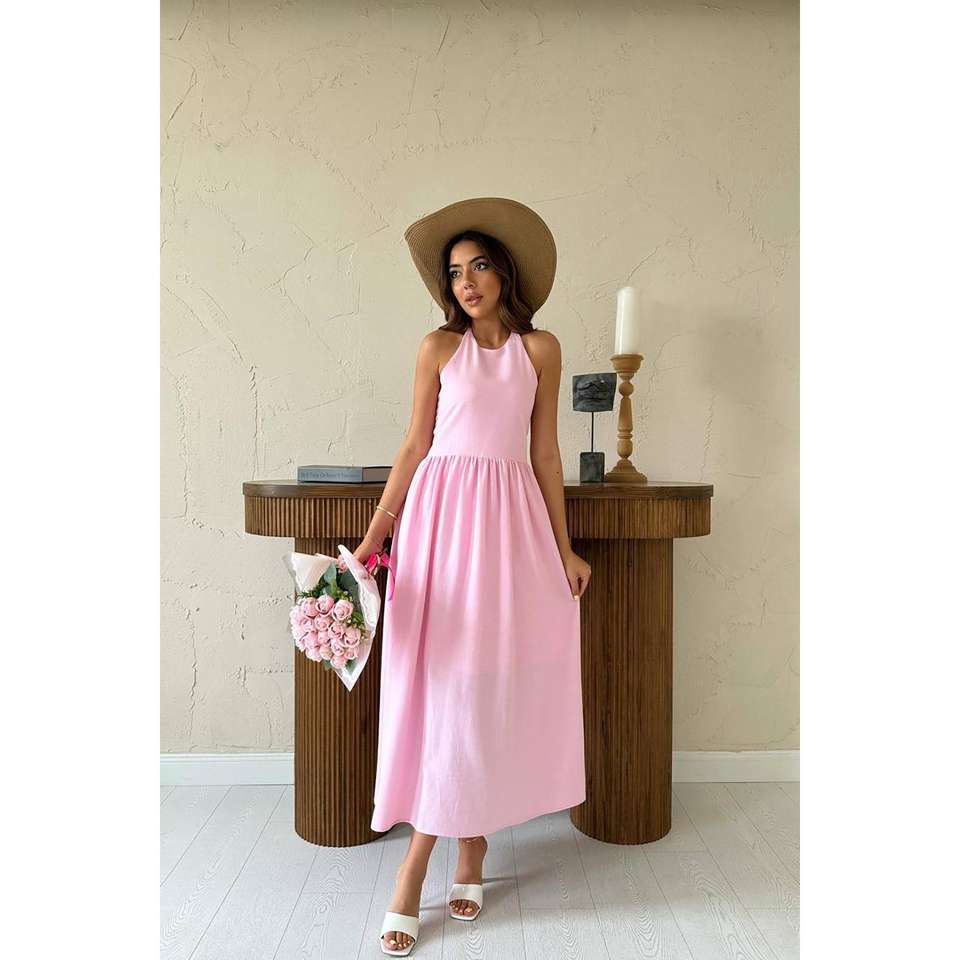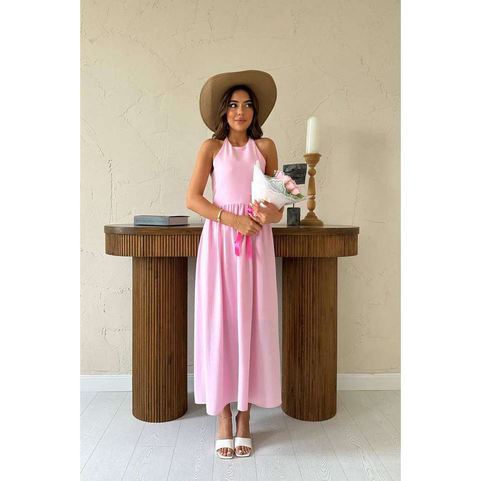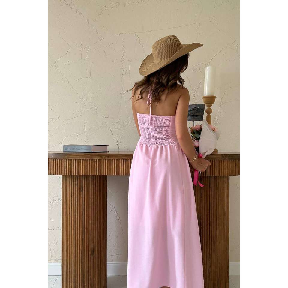 ชุดเดรสผ้าลินินสีชมพูแบบเปิดหลัง สายเดี่ยวเอวสม็อค ทรงเอไลน์ ระบายอากาศได้ดี เหมาะสำหรับวันหยุดและงานเฉลิมฉลอง สไตล์ลำลอง