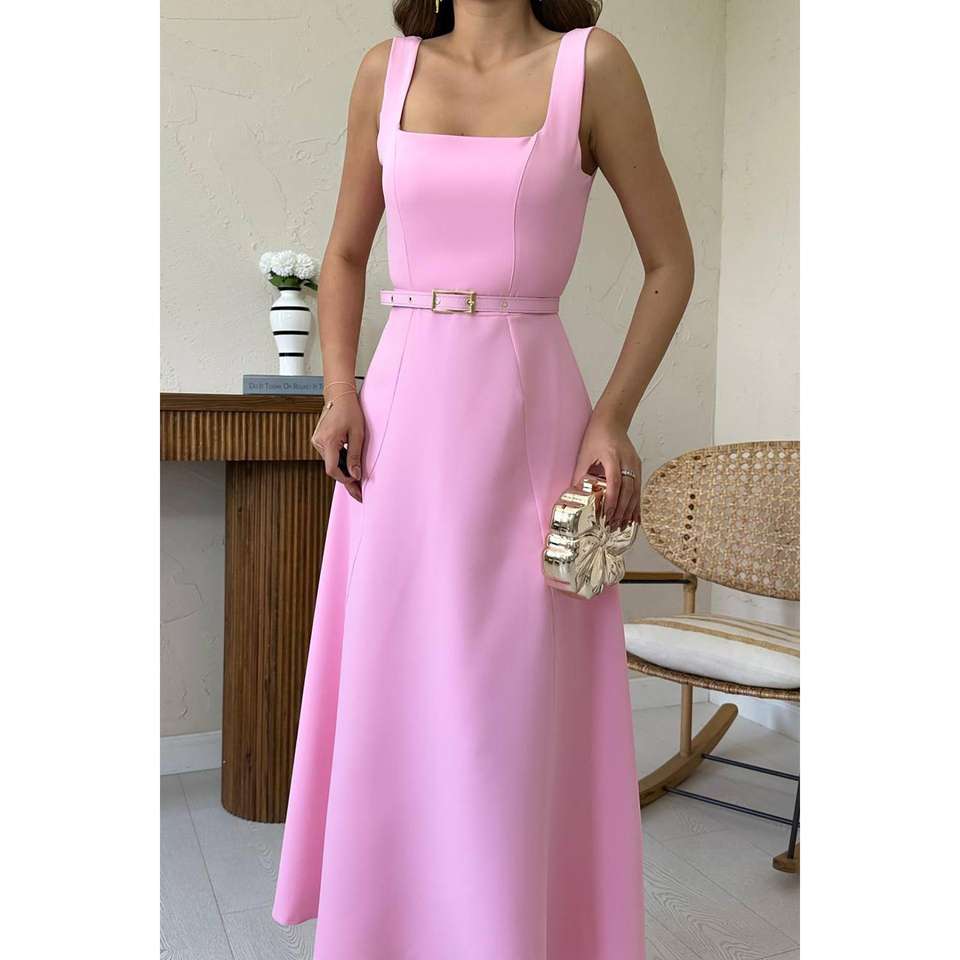 ชุดราตรีผ้าซาตินทรงเอไลน์สีชมพู คอเหลี่ยม เอวธรรมชาติ สีลูกกวาด ชุดราตรียาว