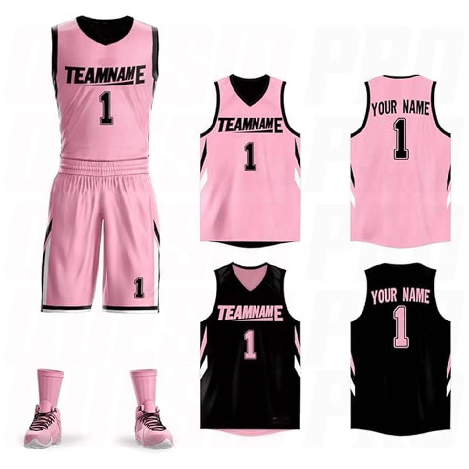 ชุดบาสเก็ตบอลสีชมพูและสีดำแบบกำหนดเอง ผ้าโพลีเอสเตอร์ แห้งเร็ว ระบายอากาศได้ดี เหมาะสำหรับการฝึกซ้อมกีฬา มีไซส์พลัส