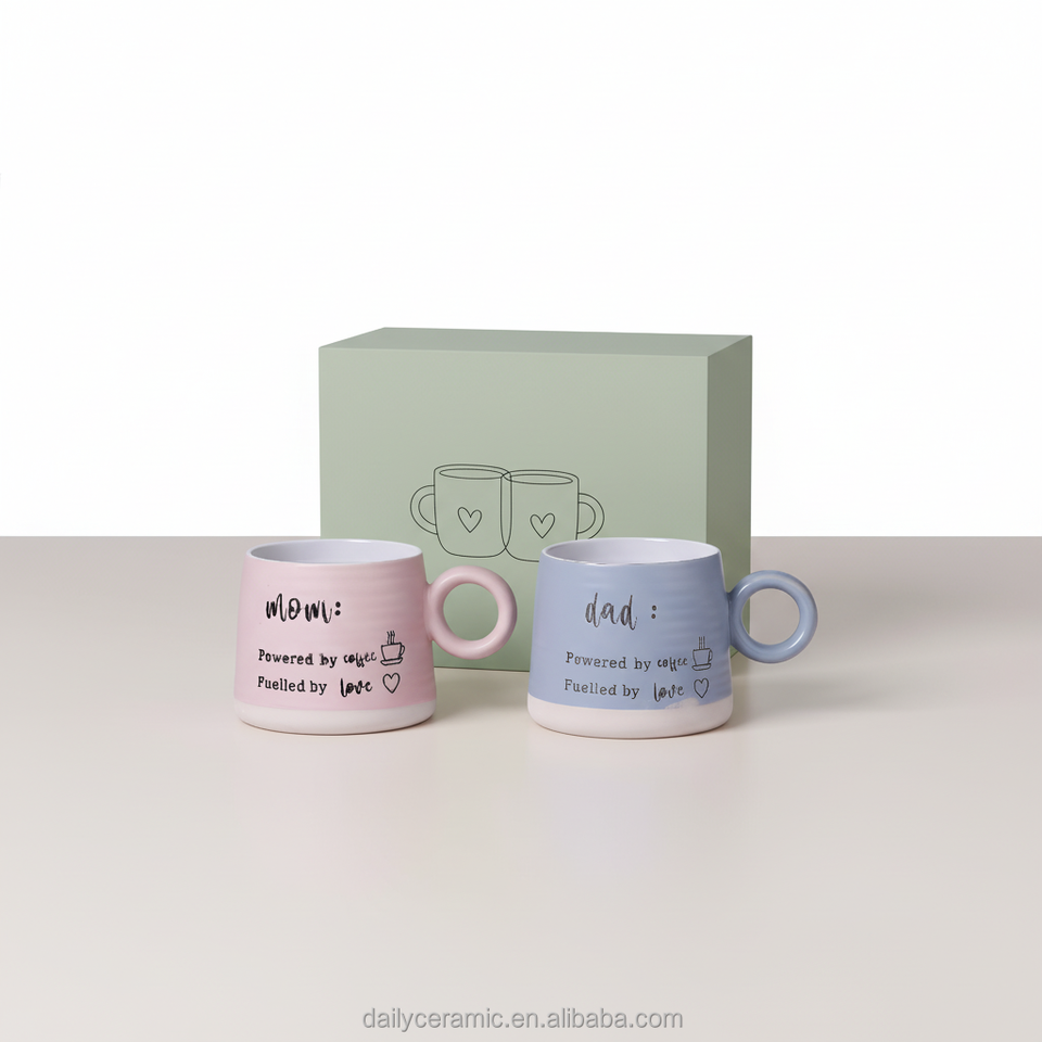 ชุดแก้วกาแฟเซรามิกสโตนแวร์สีชมพูฟ้า ลายข้อความสำหรับคุณแม่คุณพ่อ ขนาด 350 มล. พร้อมหูจับแบบโอริง ทนความร้อน ใช้กับไมโครเวฟได้