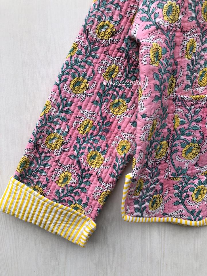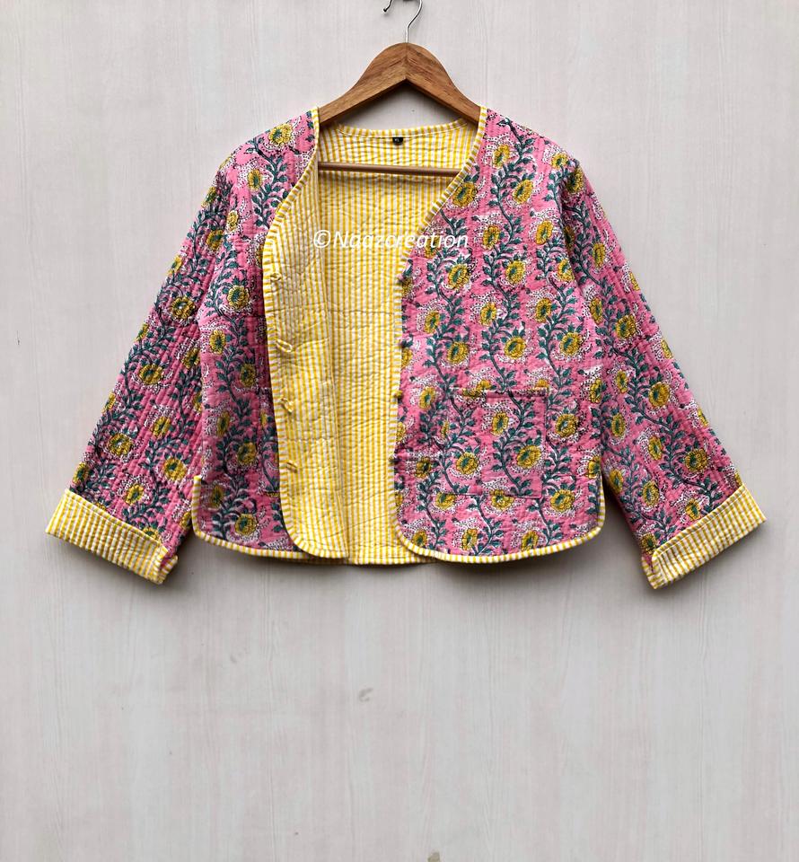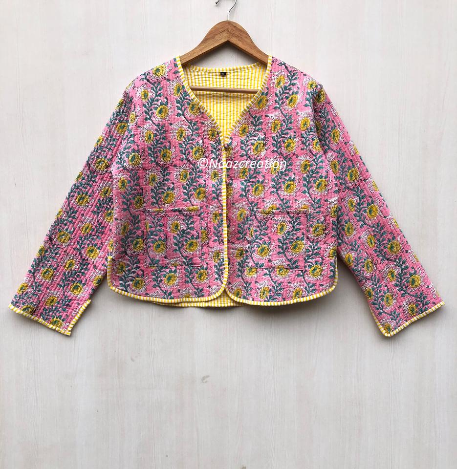 เสื้อแจ็คเก็ตโบฮีเมียนสีชมพู แบบเย็บลายดอกไม้ ทำมือจากผ้าฝ้าย สไตล์ลายดอกไม้ เสื้อโค้ทแจ็คเก็ตสำหรับฤดูใบไม้ร่วงและฤดูหนาว สตรีทแวร์ แบบสองด้าน ของขวัญสำหรับเธอ