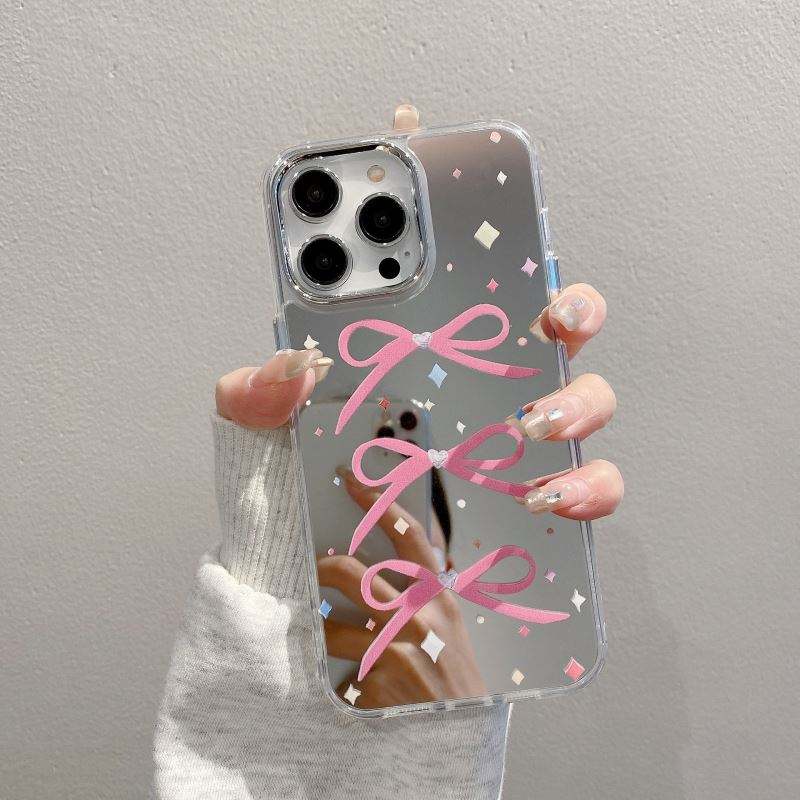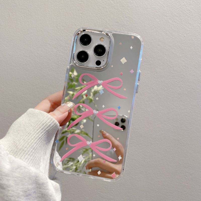 เคสโทรศัพท์ลายโบว์สีชมพูพร้อมกระจกแต่งหน้า สำหรับ iPhone 17 16 15 14 13 12 11 Pro Max XR X XS 8 7 Plus SE2 ป้องกันการกระแทก