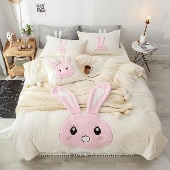 ชุดเครื่องนอนเด็กผู้หญิงผ้าฝ้ายฟอกลายการ์ตูนกระต่ายพระจันทร์ดาว,ปลอกผ้านวมชุดผ้าคลุมเตียงหมอนผ้าลินินยัดไส้40S สีชมพู