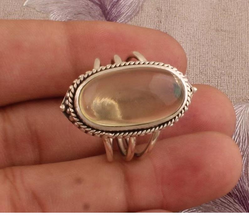 แหวนพลอยคาลซิโดนีสีชมพูใน925แหวนดีไซเนอร์เงินสเตอร์ลิงทำมือสามชั้นเครื่องประดับผู้หญิงของขวัญวันวาเลนไทน์