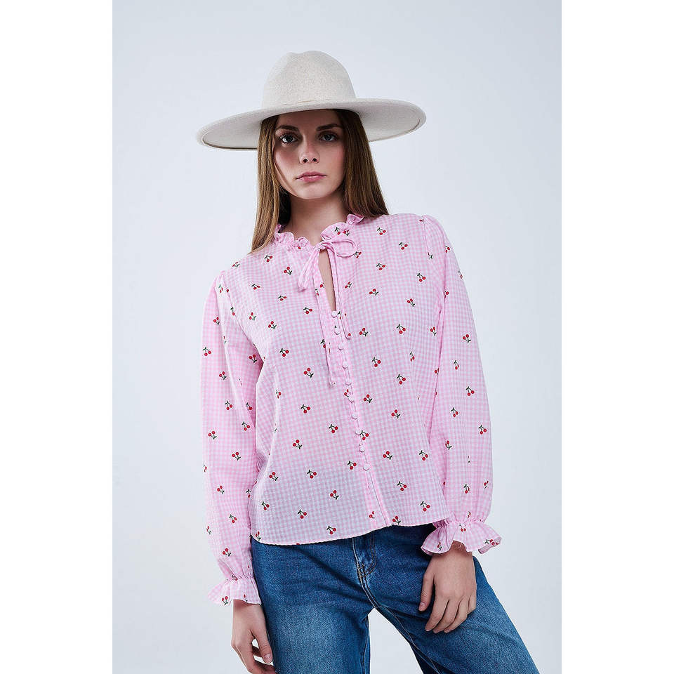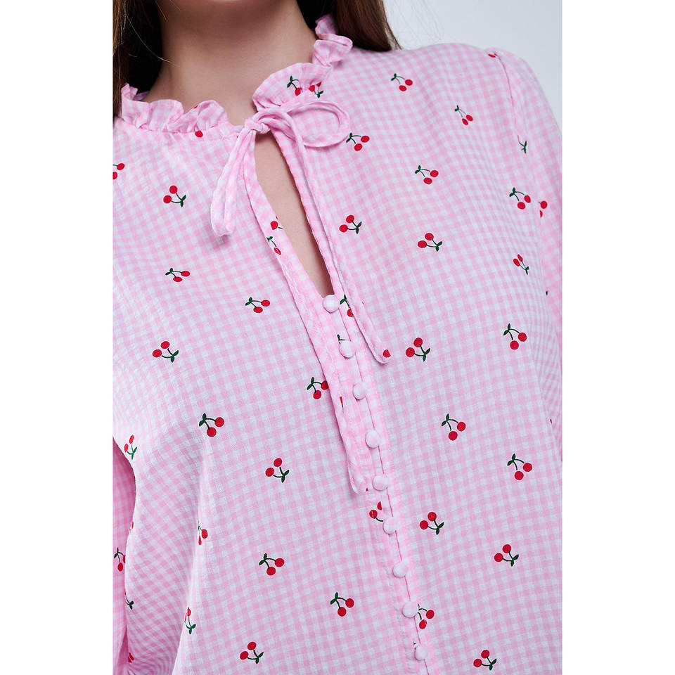 Pink Check Print Long Sleeve Relaxed Fit Romantic Style Blouse with Cherry Details and Tied Bow