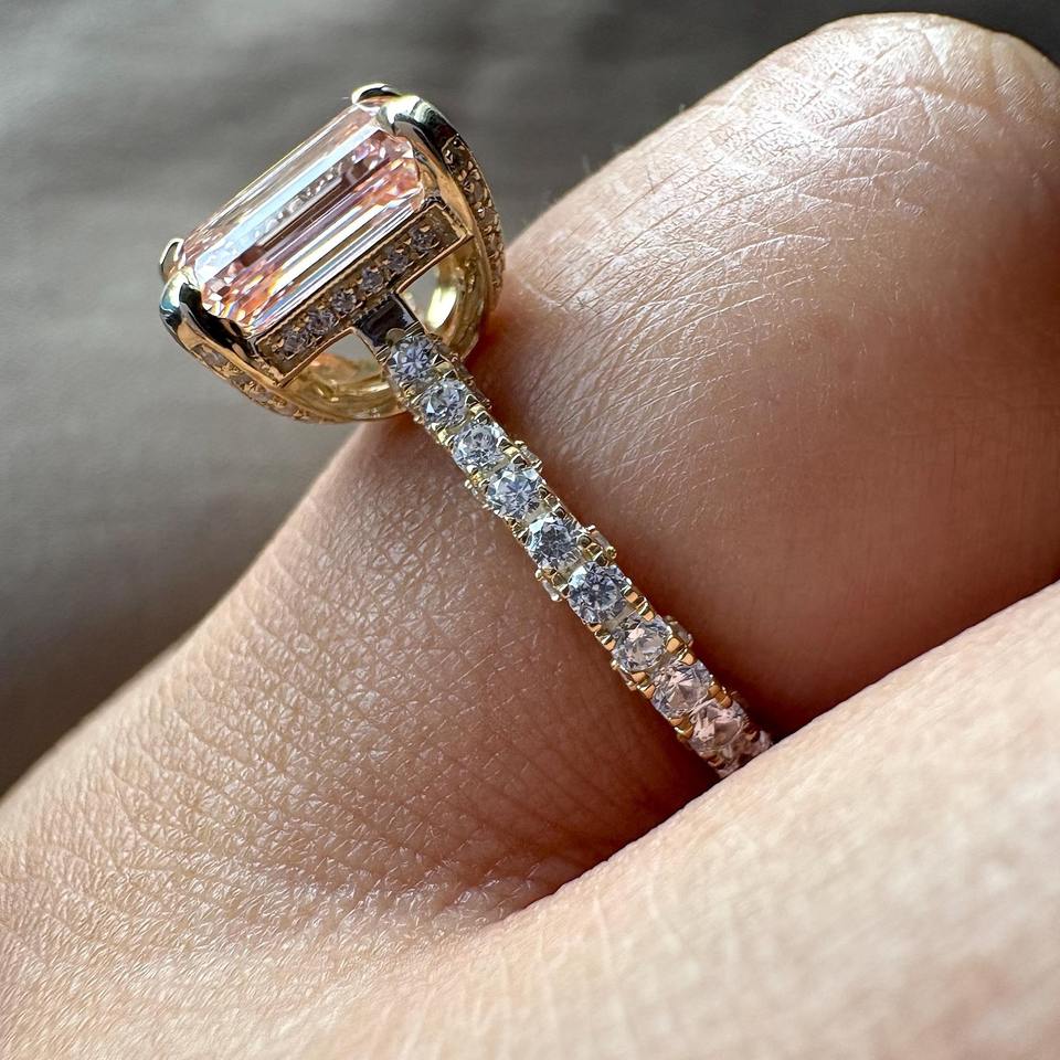แหวนหมั้นเพชรทรงสี่เหลี่ยมมรกตสีชมพู ผลิตในห้องปฏิบัติการ ประดับด้วยเพชรแบบซ่อนในวงแหวน พร้อมใบรับรอง IGI ตัวเรือนทอง 14k สำหรับวันวาเลนไทน์