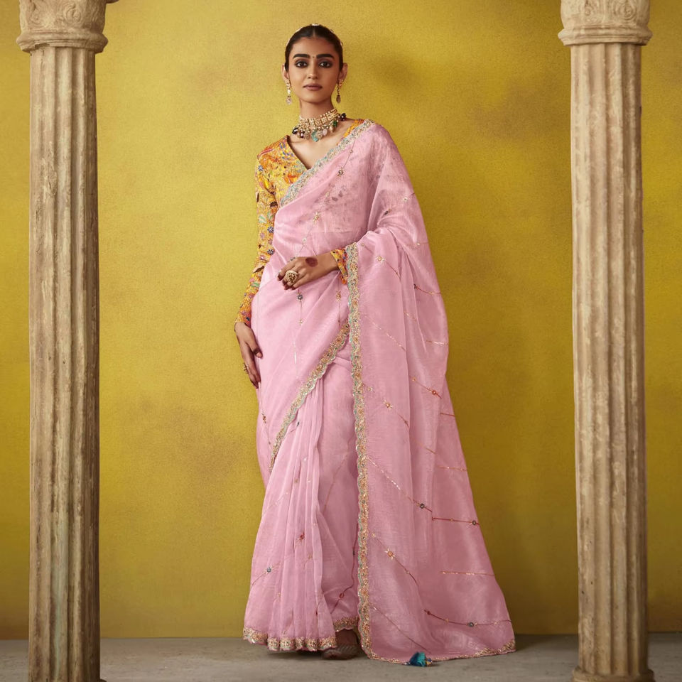 ชุดแต่งงานแบบดั้งเดิมสีชมพู ผ้าชีฟองเนื้อนุ่ม ดีไซน์สวยงามจากอินเดีย เหมาะสำหรับงานแต่งงานแบบปากีสถาน