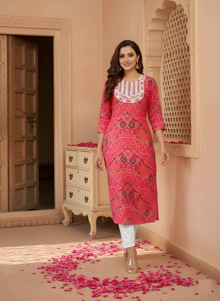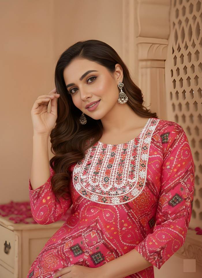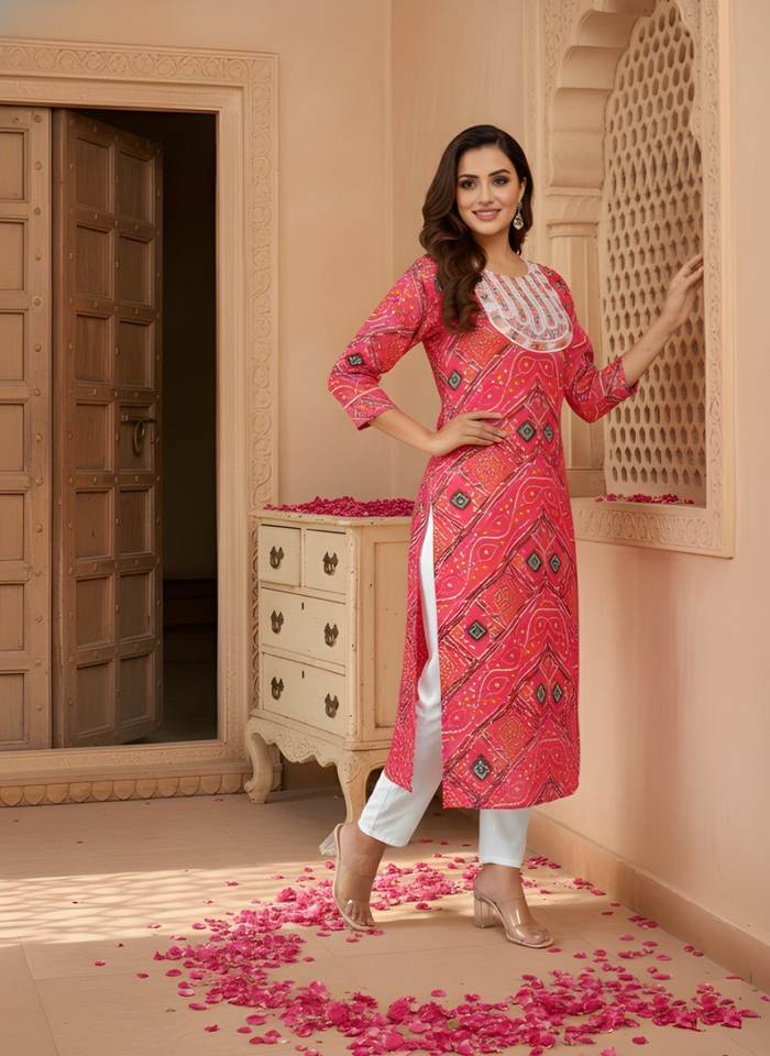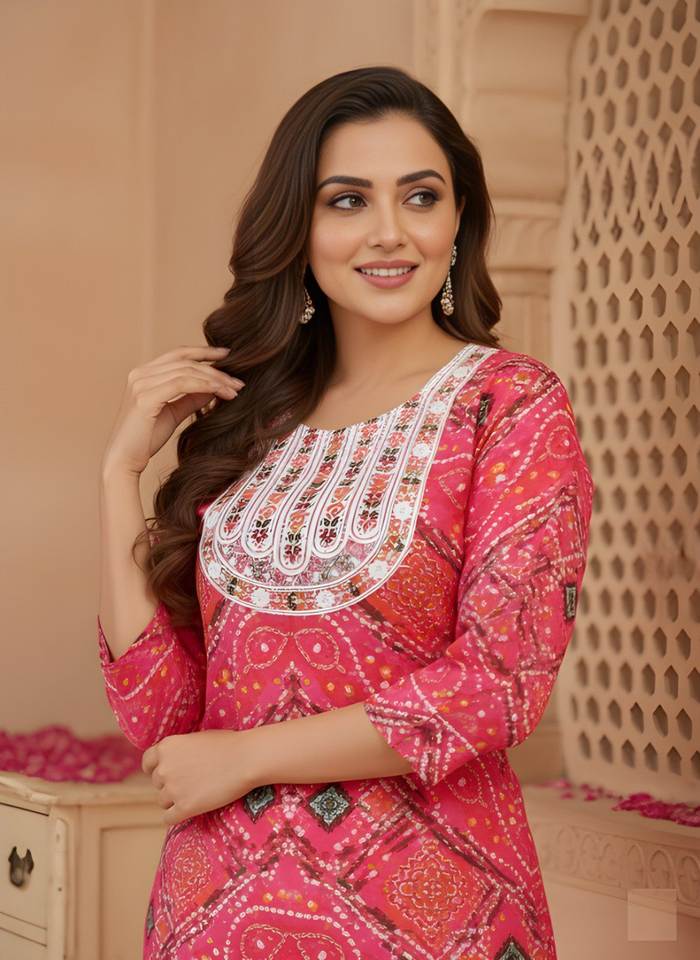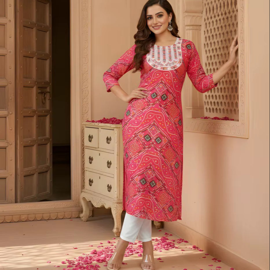 ชุดคุรตะผ้าฝ้ายสีชมพูพิมพ์ลาย คอทรงกลม ความยาวระดับน่อง ชุดลำลองสไตล์ชาติพันธุ์สำหรับผู้หญิง ไซส์ M L XL XXL