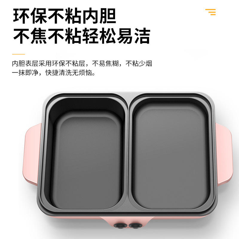 หม้อไฟฟ้าสีชมพูพร้อมเตาปิ้งย่าง ขนาด 34.5x22x8 ซม. แบบสองโซน ควบคุมด้วยปุ่มกด สำหรับใช้ในครัวเรือน