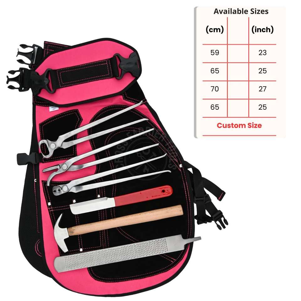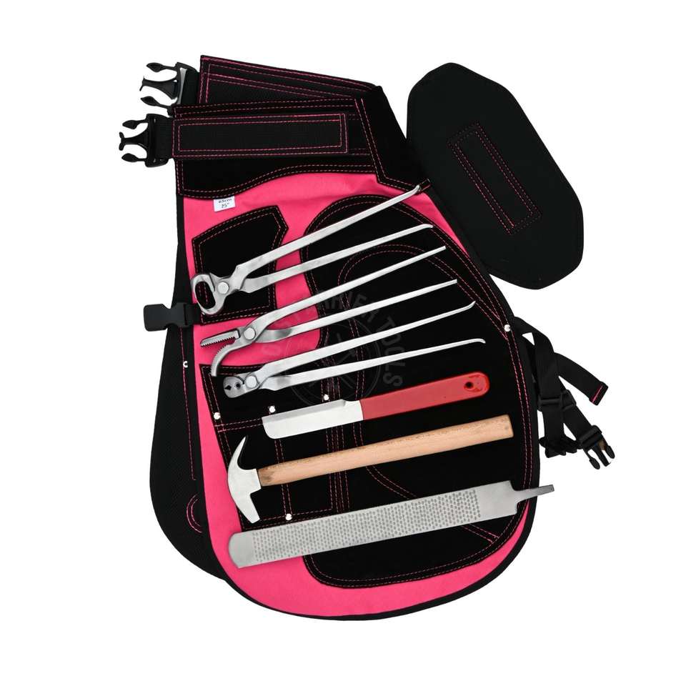 ชื่อสินค้า:ชุดผ้ากันเปื้อนและกางเกงขาสั้นสำหรับช่างเกือกม้าสีชมพู พร้อมเครื่องมือและชุดอุปกรณ์ตัดแต่งกีบม้า